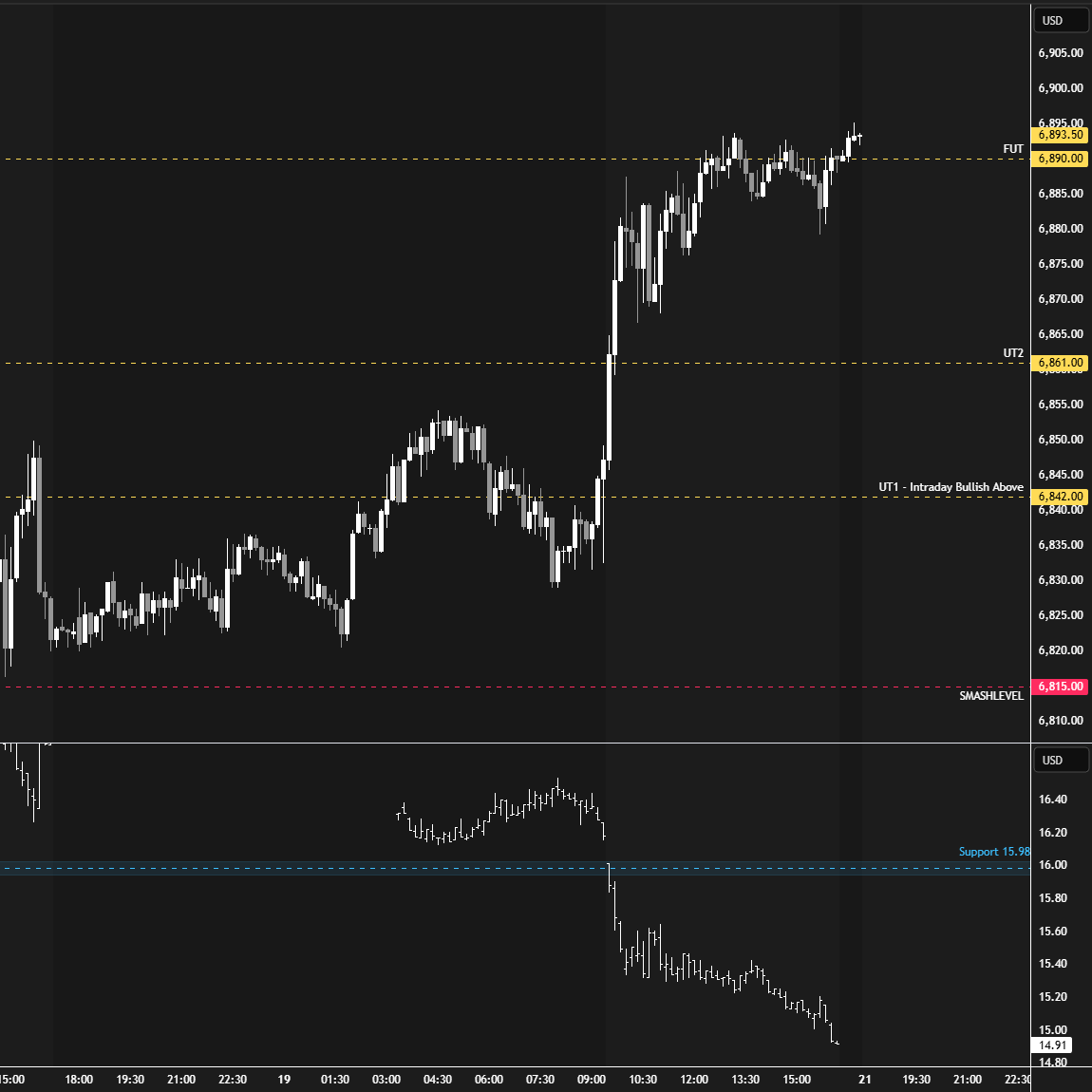 On the flip side, reclaiming and holding above 6891 would shift focus to 6909 (UT1), with a final upside target at 6931 (FUT) under sustained buying pressure.