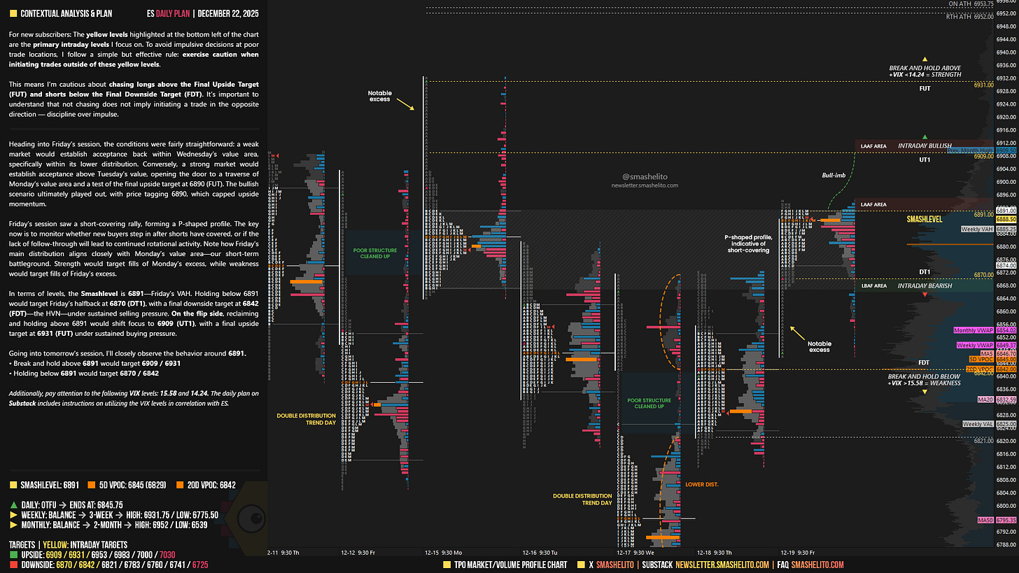 Heading into Friday’s session, the conditions were fairly straightforward: a weak market would establish acceptance back within Wednesday’s value area, specifically within its lower distribution. Conversely, a strong market would establish acceptance above Tuesday’s value, opening the door to a traverse of Monday’s value area and a test of the final upside target at 6890 (FUT). The bullish scenario ultimately played out, with price tagging 6890, which capped upside momentum.