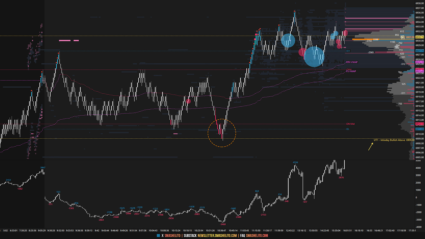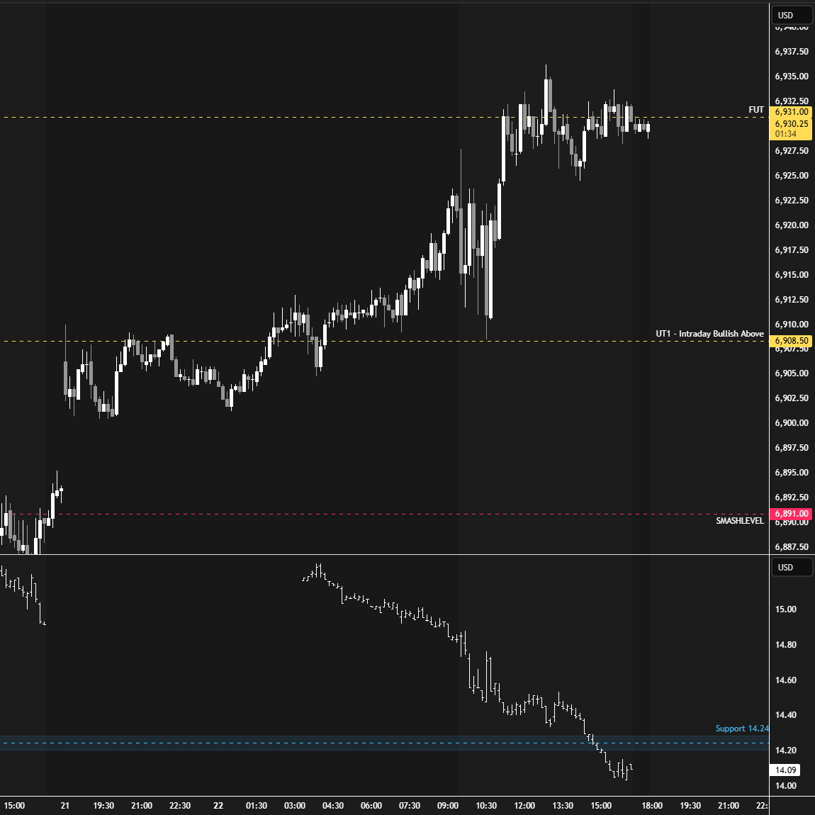 In terms of levels, the Smashlevel is 6925—the afternoon pullback low. Holding above 6925 would target the overnight ATH at 6953 (UT1), with a final upside target at 6983 (FUT) under sustained buying pressure.