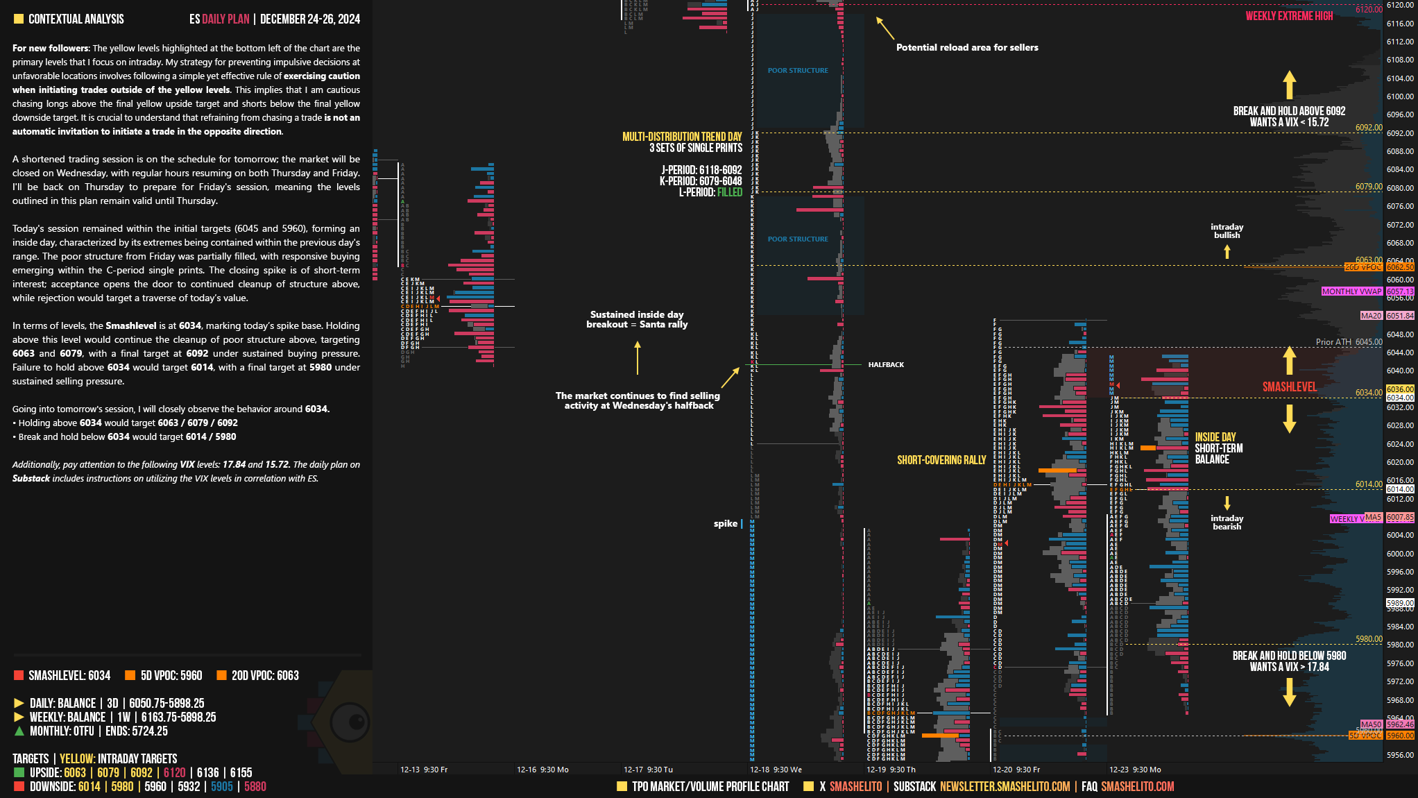 Today's session remained within the initial targets (6045 and 5960), forming an inside day, characterized by its extremes being contained within the previous day's range. The poor structure from Friday was partially filled, with responsive buying emerging within the C-period single prints. The closing spike is of short-term interest; acceptance opens the door to continued cleanup of structure above, while rejection would target a traverse of today’s value.