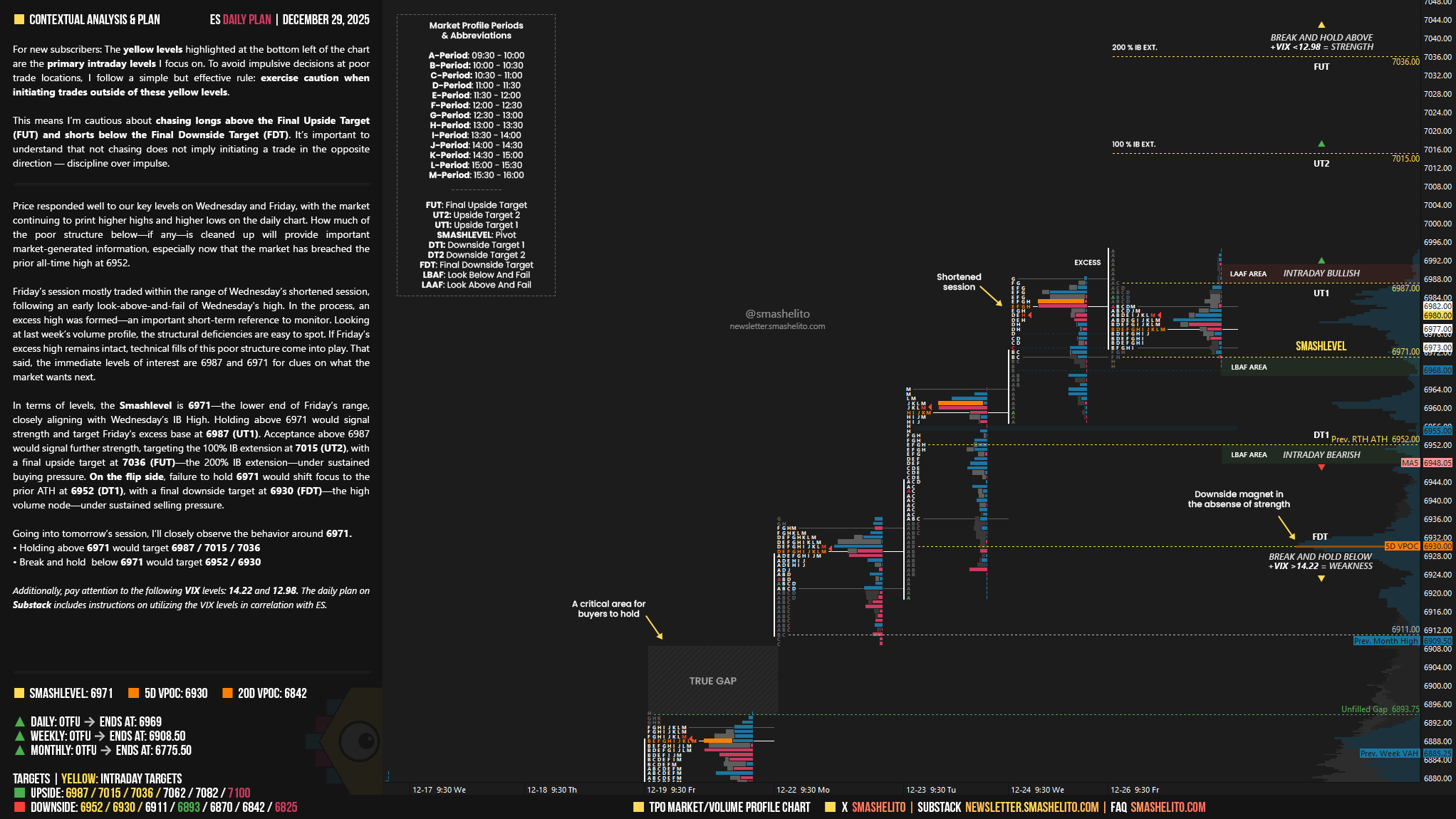 In terms of levels, the Smashlevel is 6971—the lower end of Friday’s range, closely aligning with Wednesday’s IB High. Holding above 6971 would signal strength and target Friday’s excess base at 6987 (UT1). Acceptance above 6987 would signal further strength, targeting the 100% IB extension at 7015 (UT2), with a final upside target at 7036 (FUT)—the 200% IB extension—under sustained buying pressure.