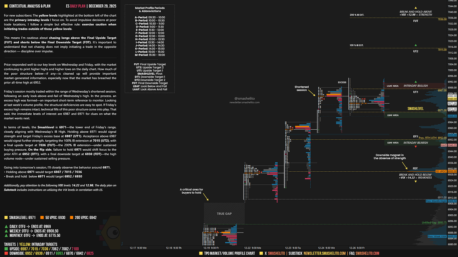 Price responded well to our key levels on Wednesday and Friday, with the market continuing to print higher highs and higher lows on the daily chart. How much of the poor structure below—if any—is cleaned up will provide important market-generated information, especially now that the market has breached the prior all-time high at 6952.