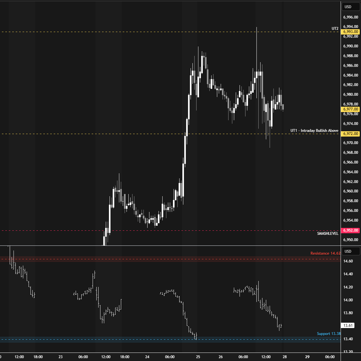 The yellow levels highlighted at the bottom left of the chart are the primary intraday levels I focus on. To avoid impulsive decisions at poor trade locations, I follow a simple but effective rule: exercise caution when initiating trades outside of these yellow levels.