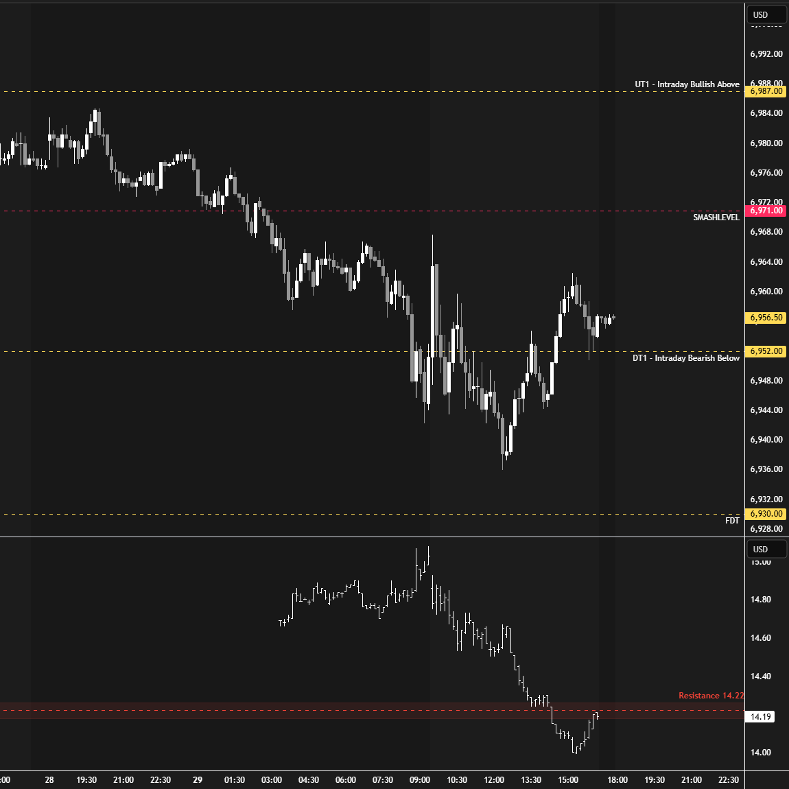 On the flip side, reclaiming and holding above 6969 would signal strength, targeting 6987 (UT1), with a final upside target at 7015 (FUT)—the 100% IB extension—under sustained buying pressure.