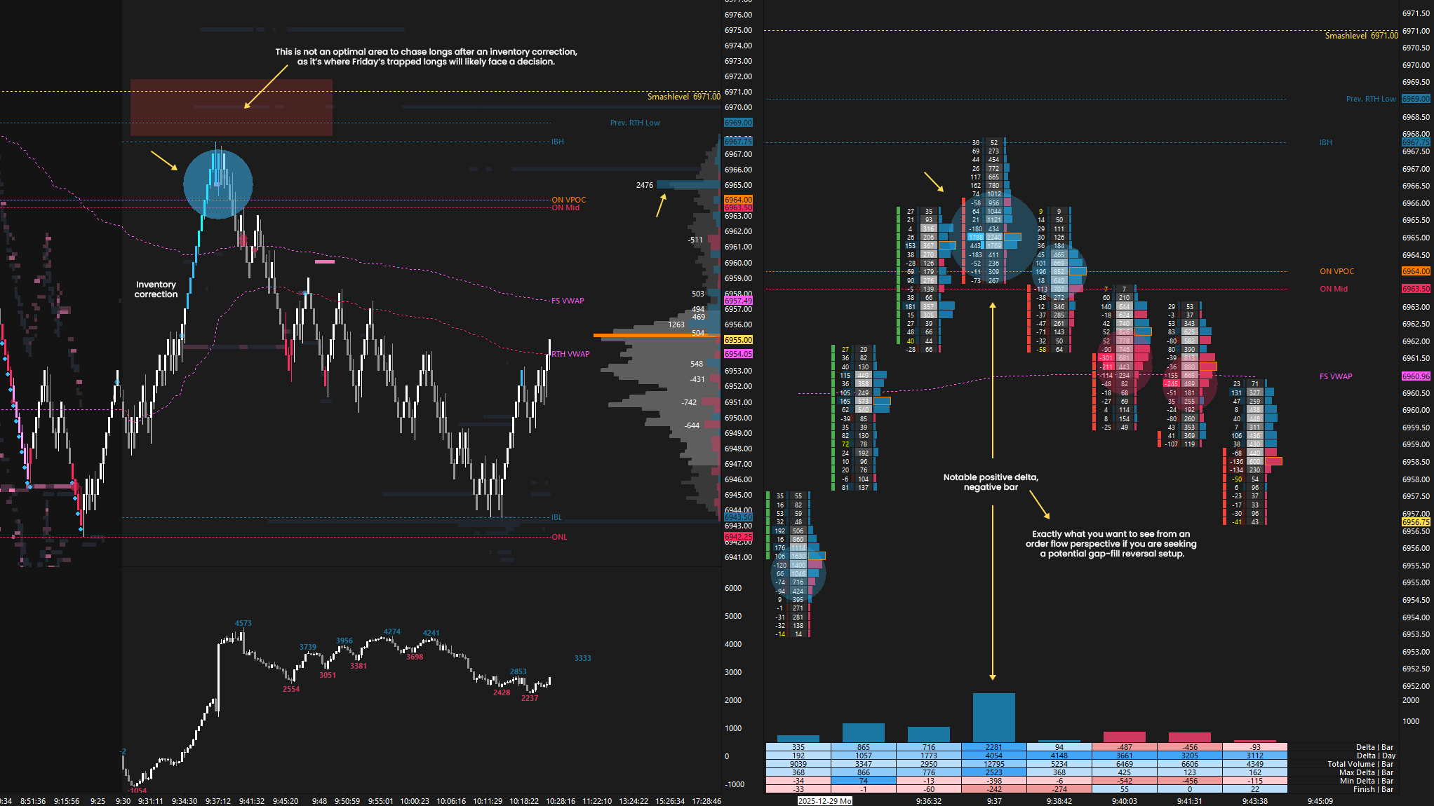 The A-period provided a clean reversal setup just shy of the gap fill at 6969, slightly below the Smashlevel at 6971. Aggressive buyers were absorbed by a passive seller, triggering a reversal (see Figure 1). This was a textbook example of the risk of chasing an inventory correction at a poor location near the gap fill. Context sets the stage; order flow provides the confirmation.