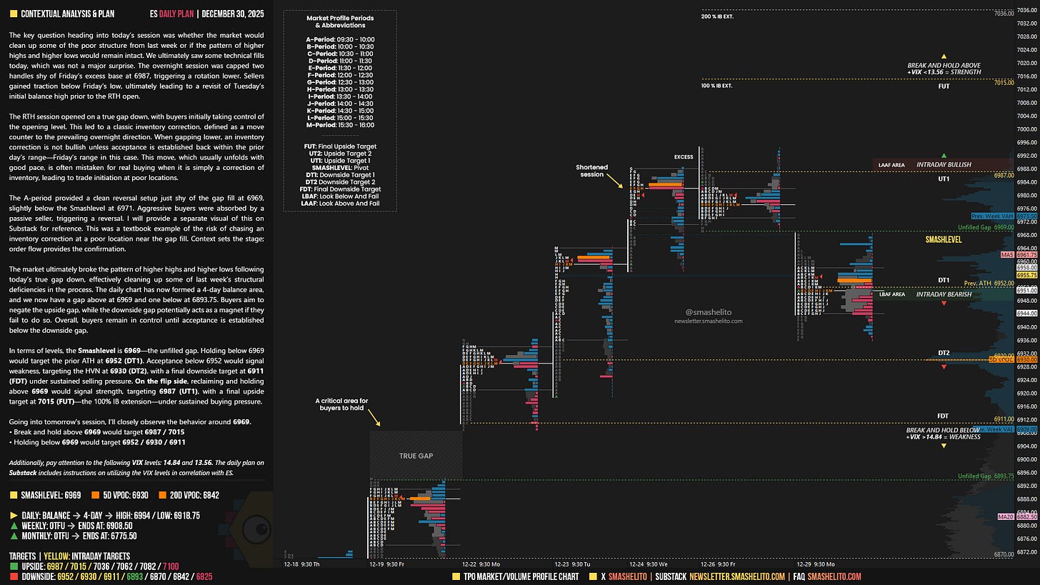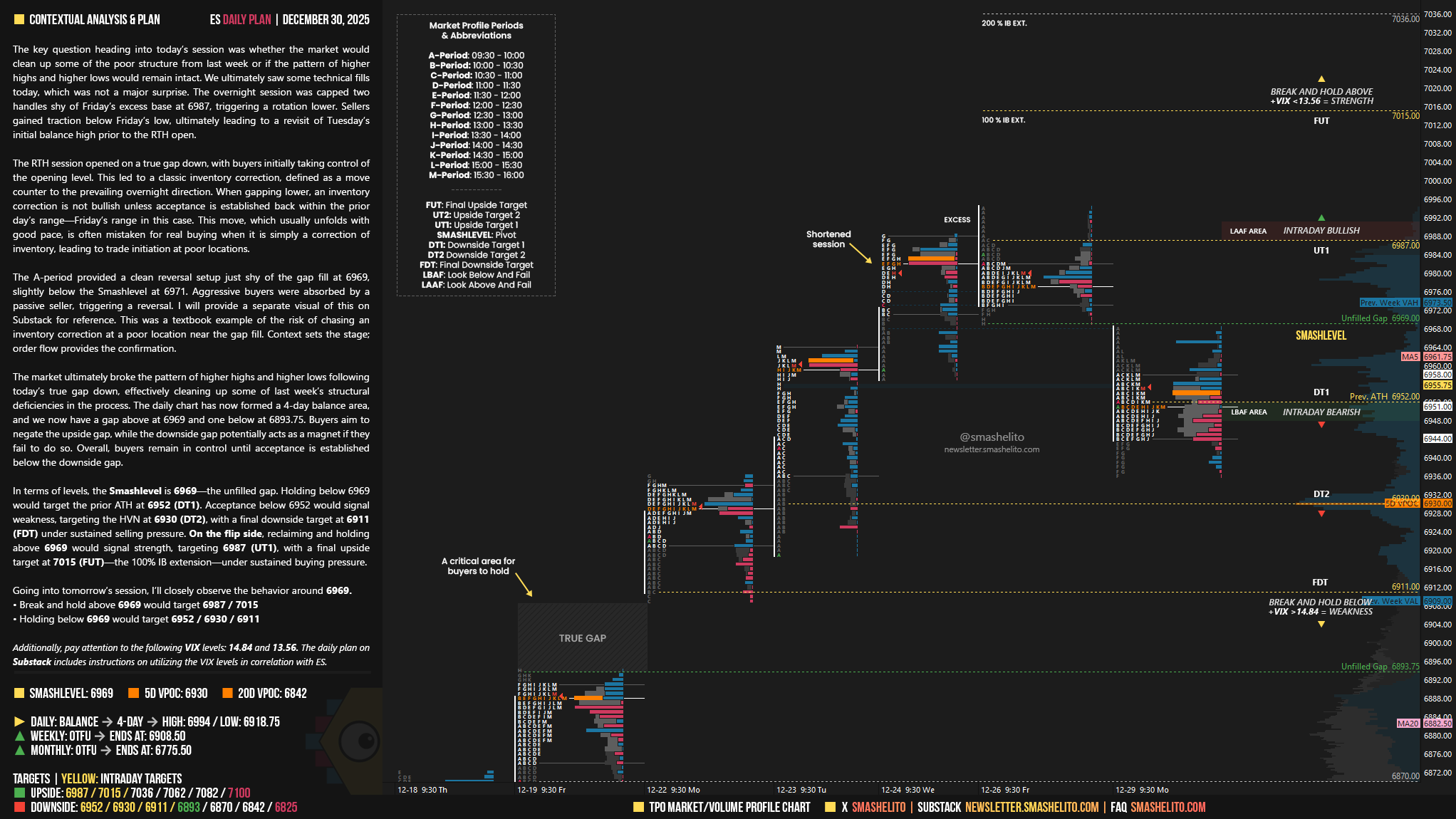 The market ultimately broke the pattern of higher highs and higher lows following today’s true gap down, effectively cleaning up some of last week’s structural deficiencies in the process. The daily chart has now formed a 4-day balance area, and we now have a gap above at 6969 and one below at 6893.75. Buyers aim to negate the upside gap, while the downside gap potentially acts as a magnet if they fail to do so. Overall, buyers remain in control until acceptance is established below the downside gap.
