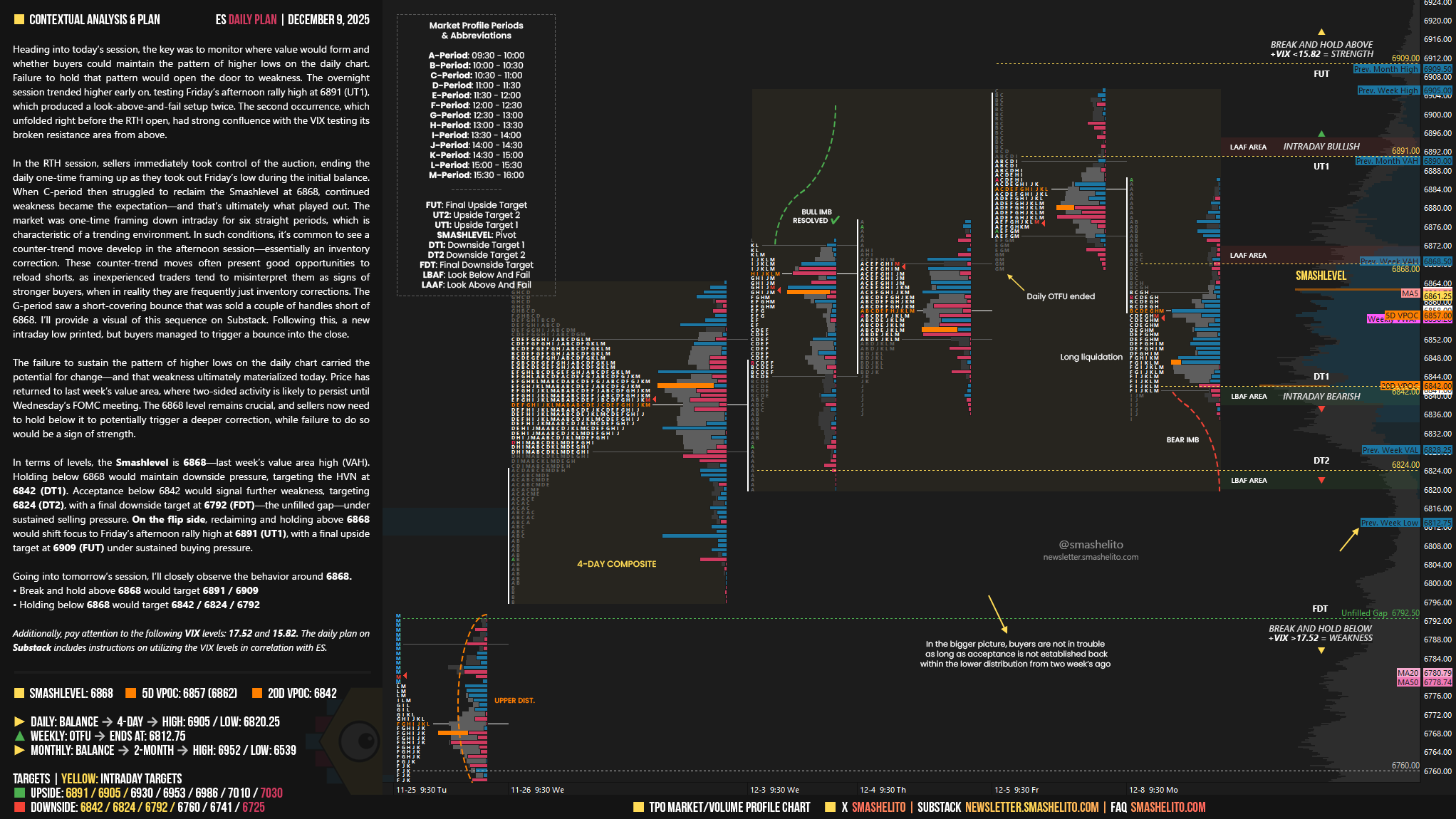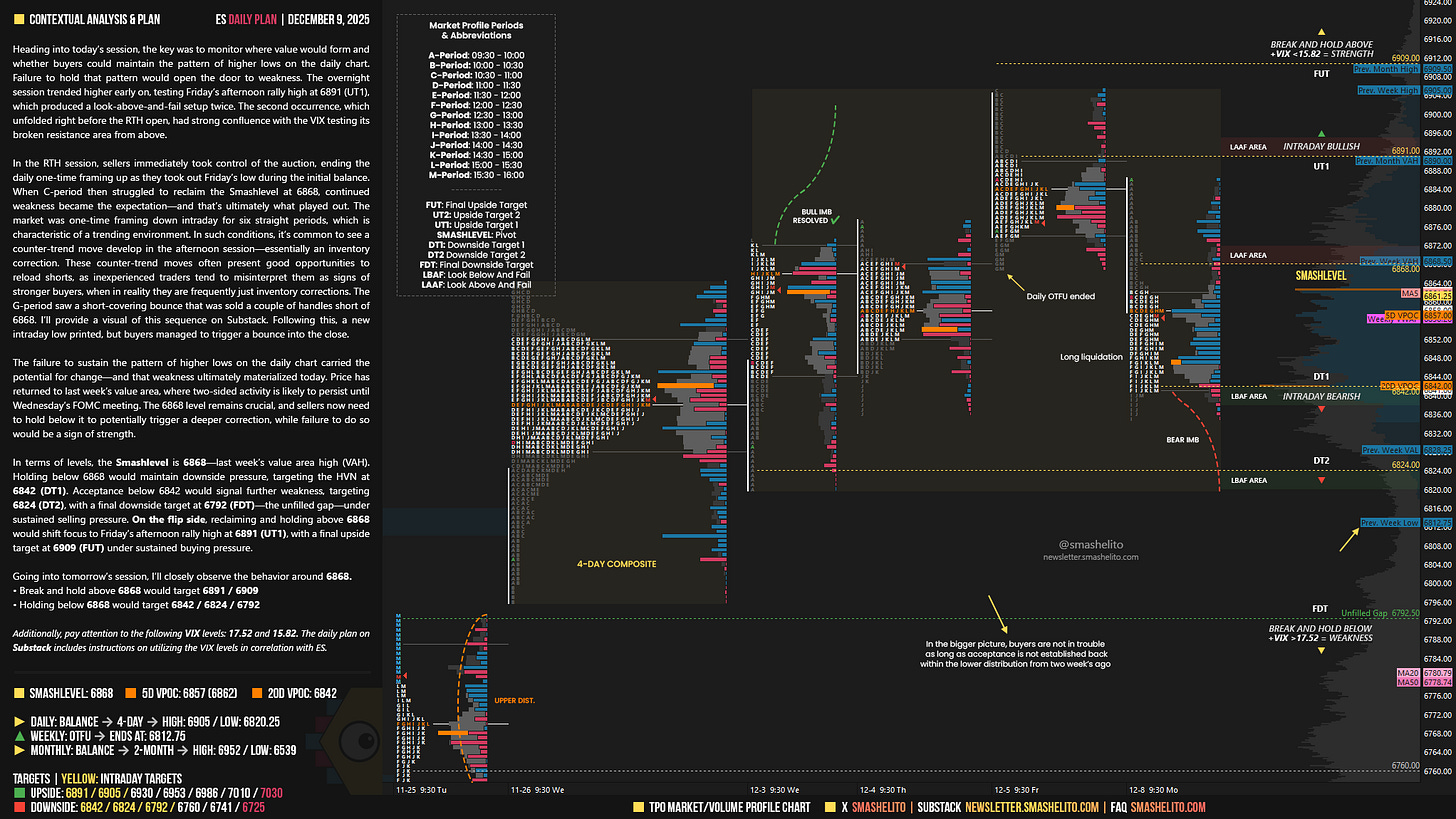 Heading into today’s session, the key was to monitor where value would form and whether buyers could maintain the pattern of higher lows on the daily chart. Failure to hold that pattern would open the door to weakness. The overnight session trended higher early on, testing Friday’s afternoon rally high at 6891 (UT1), which produced a look-above-and-fail setup twice. The second occurrence, which unfolded right before the RTH open, had strong confluence with the VIX testing its broken resistance area from above.