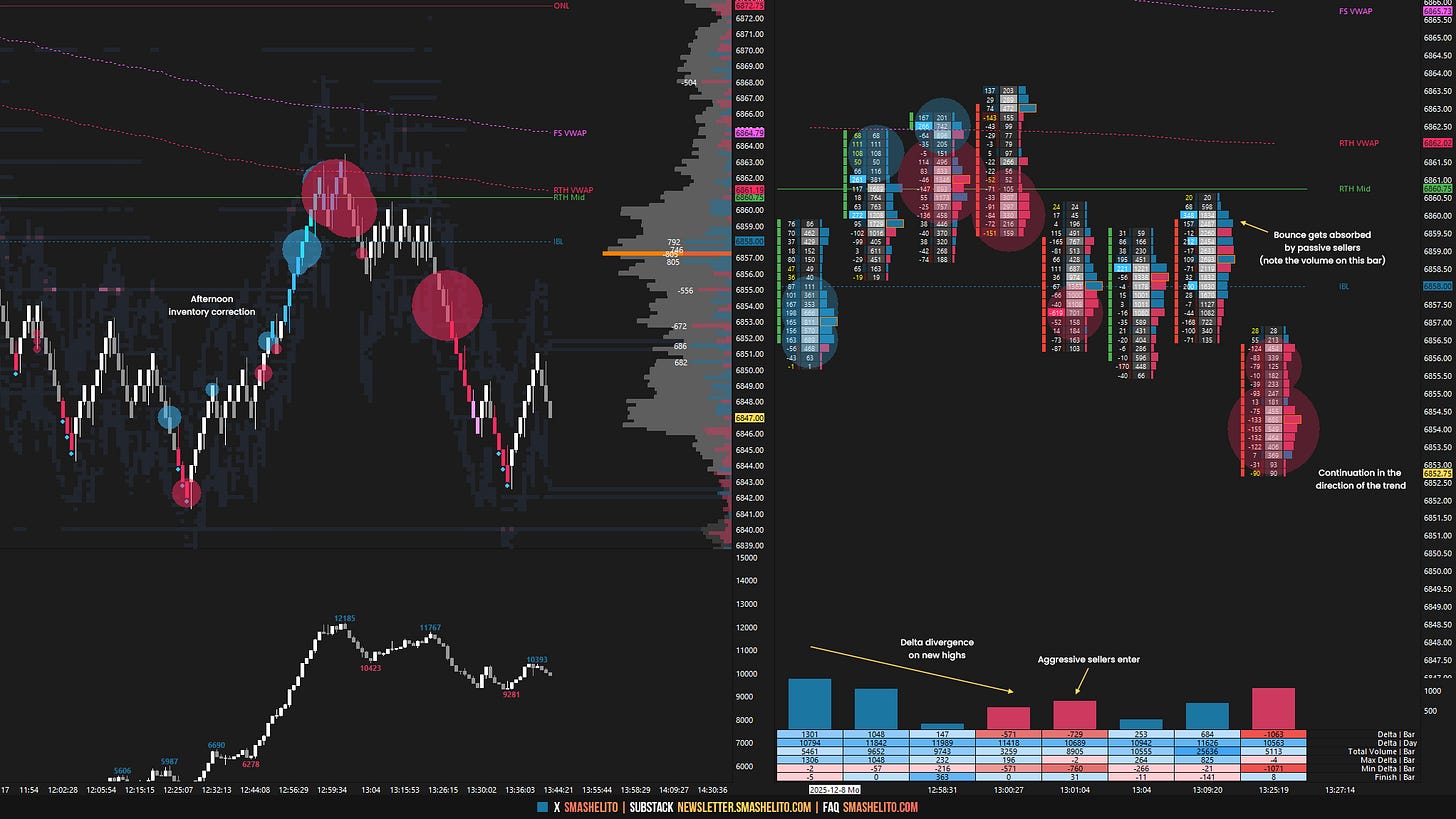 In the RTH session, sellers immediately took control of the auction, ending the daily one-time framing up as they took out Friday’s low during the initial balance. When C-period then struggled to reclaim the Smashlevel at 6868, continued weakness became the expectation—and that’s ultimately what played out. The market was one-time framing down intraday for six straight periods, which is characteristic of a trending environment. In such conditions, it’s common to see a counter-trend move develop in the afternoon session—essentially an inventory correction. These counter-trend moves often present good opportunities to reload shorts, as inexperienced traders tend to misinterpret them as signs of stronger buyers, when in reality they are frequently just inventory corrections. The G-period saw a short-covering bounce that was sold a couple of handles short of 6868 (see Figure 1). Following this, a new intraday low printed, but buyers managed to trigger a bounce into the close.