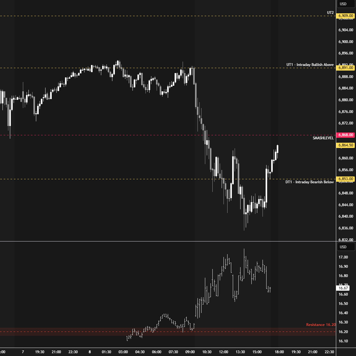 Break and hold above 6909 with VIX below 15.82 would confirm strength.