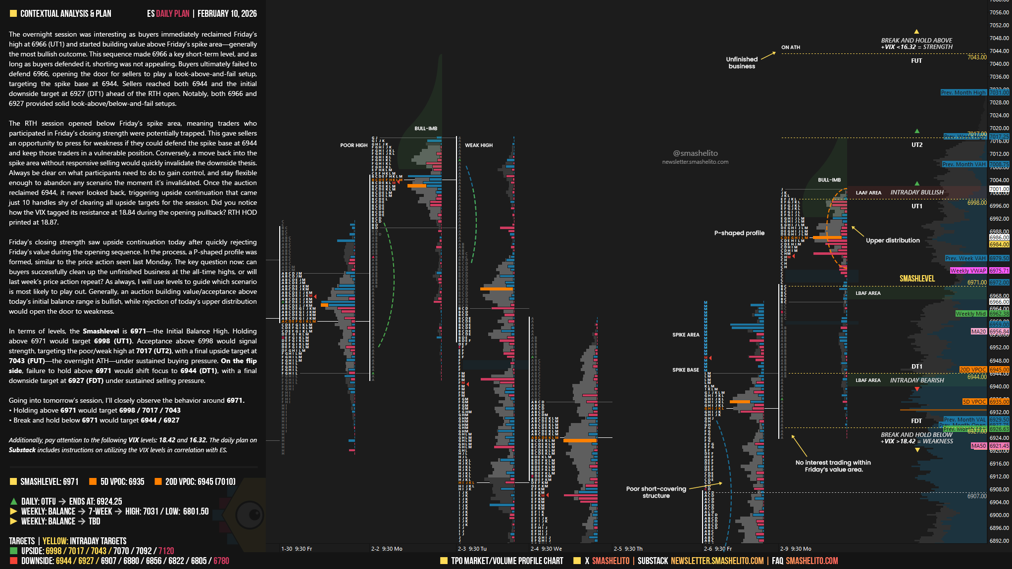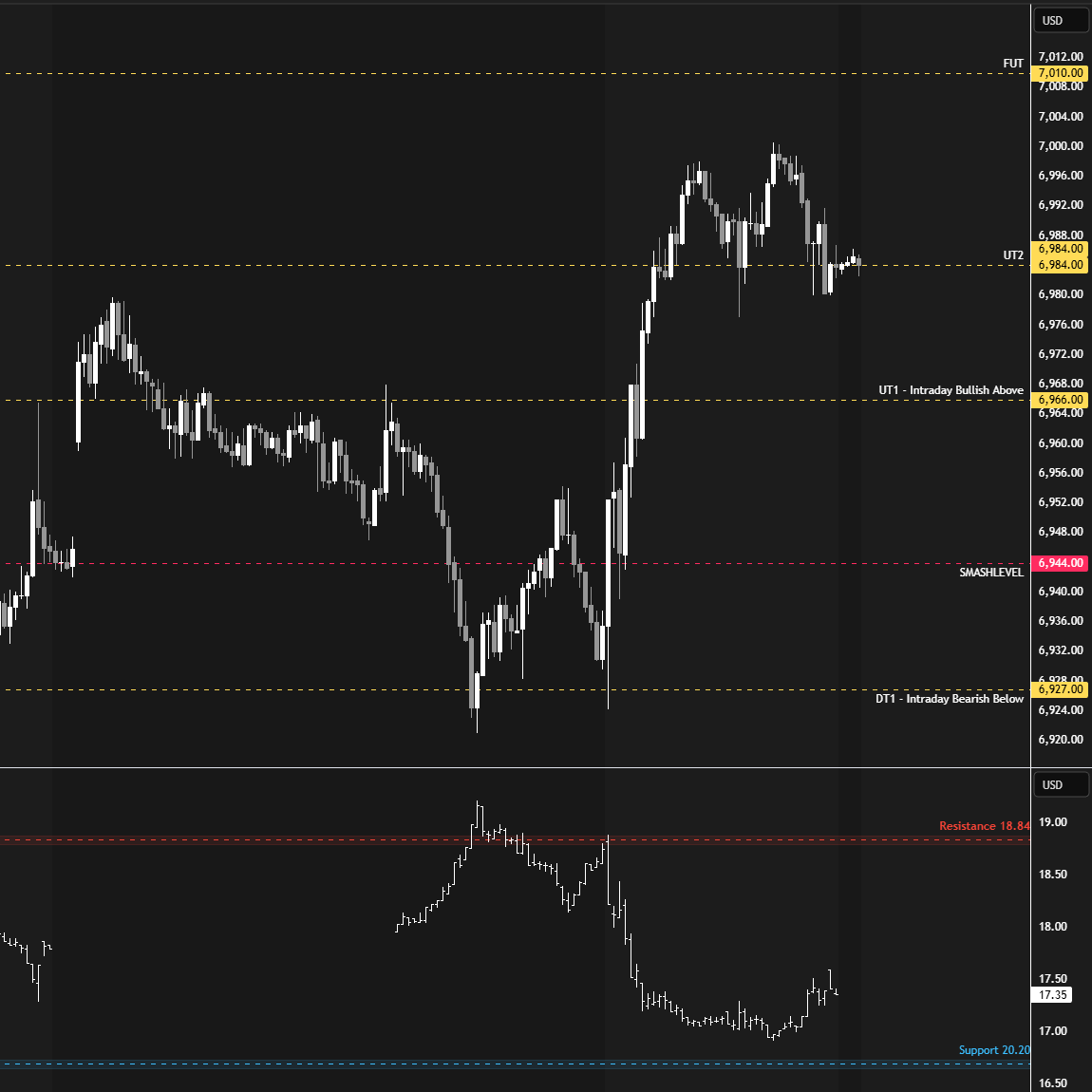 In terms of levels, the Smashlevel is 6971—the Initial Balance High. Holding above 6971 would target 6998 (UT1). Acceptance above 6998 would signal strength, targeting the poor/weak high at 7017 (UT2), with a final upside target at 7043 (FUT)—the overnight ATH—under sustained buying pressure.