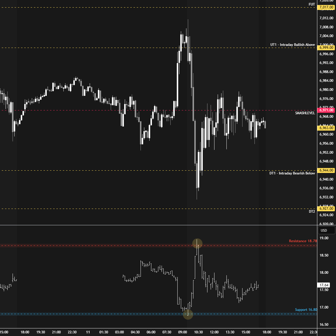 The RTH session opened above both Monday’s and Tuesday’s value areas, and the opening push higher came within five handles of tagging the final upside target at 7017 (FUT) before a sharp reversal unfolded, catching many traders off guard. During this sequence, the VIX tested its support level at 16.80 (LOD: 16.75), which effectively marked the HOD in ES. Later in the session, the VIX resistance level at 18.78 notably coincided with the LOD in ES (see Figure 1).