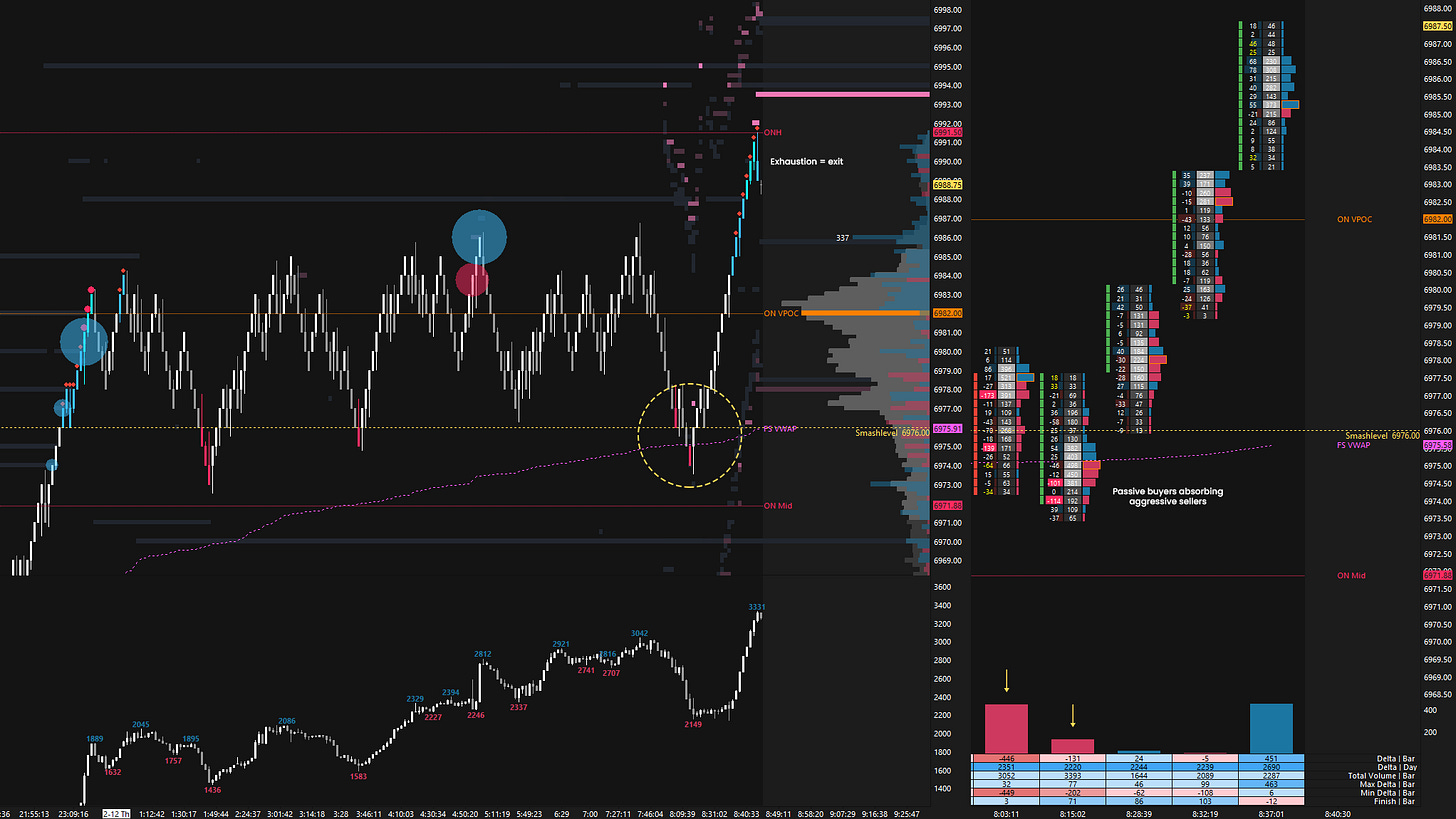 The overnight session quickly reclaimed the Smashlevel at 6976, presenting solid scalping opportunities, particularly during the push higher ahead of the RTH open (see Figure 1). However, sellers were responsive within Wednesday’s excess high. The key for the RTH session was whether buyers could continue to defend 6976, having already done so on multiple occasions overnight.