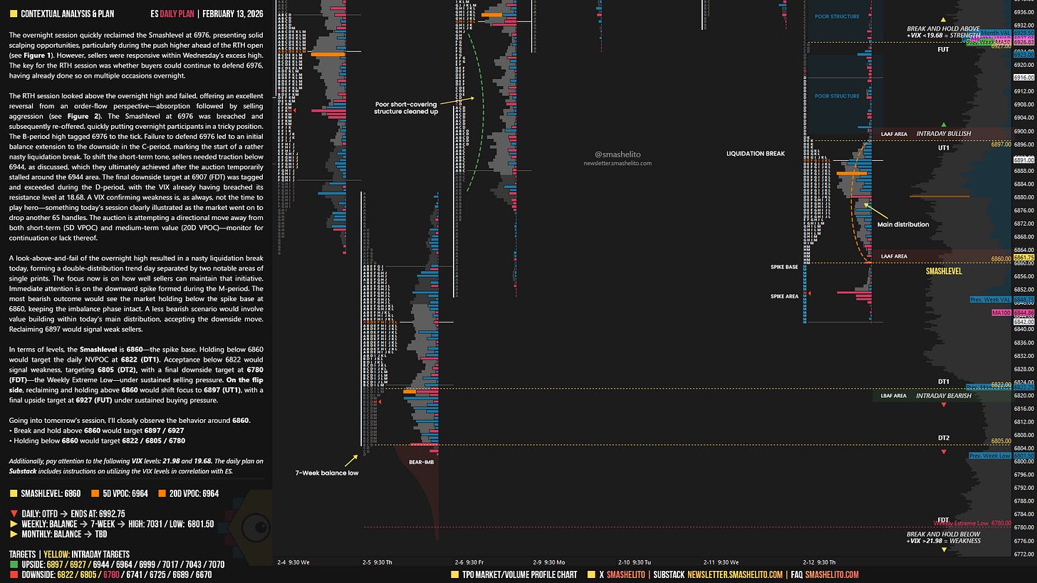 The RTH session looked above the overnight high and failed, offering an excellent reversal from an order-flow perspective—absorption followed by selling aggression (see Figure 2). The Smashlevel at 6976 was breached and subsequently re-offered, quickly putting overnight participants in a tricky position. The B-period high tagged 6976 to the tick. Failure to defend 6976 led to an initial balance extension to the downside in the C-period, marking the start of a rather nasty liquidation break. To shift the short-term tone, sellers needed traction below 6944, as discussed, which they ultimately achieved after the auction temporarily stalled around the 6944 area. The final downside target at 6907 (FDT) was tagged and exceeded during the D-period, with the VIX already having breached its resistance level at 18.68. A VIX confirming weakness is, as always, not the time to play hero—something today’s session clearly illustrated as the market went on to drop another 65 handles. The auction is attempting a directional move away from both short-term (5D VPOC) and medium-term value (20D VPOC)—monitor for continuation or lack thereof.