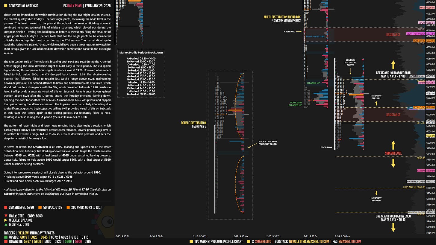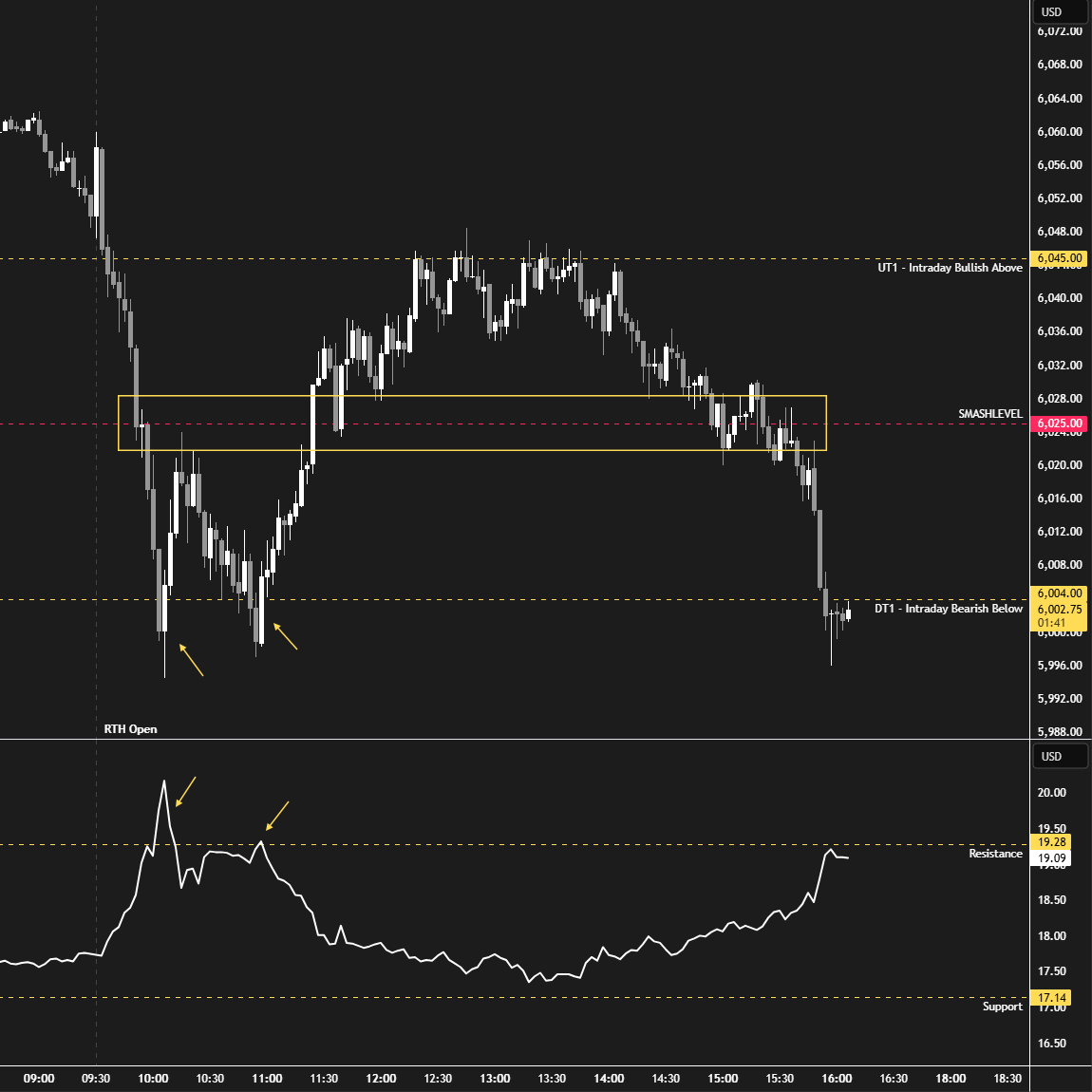 The RTH session sold off immediately, breaking both 6045 and 6025 during the A-period before tagging the initial downside target of 6004 early in the B-period. The VIX spiked higher during this sequence, breaking its resistance level at 19.28. However, when sellers failed to hold below 6004, the VIX dropped back below 19.28. The short-covering bounce that followed failed to reclaim last week’s range above 6025, maintaining downside pressure. The second attempt to break and hold below 6004 also failed, which stood out due to a divergence with the VIX, which remained below its 19.28 resistance level.
