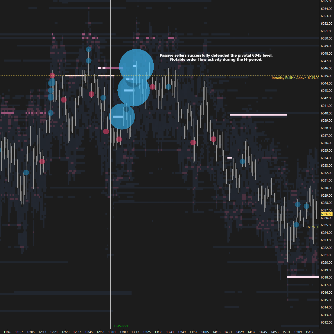 Buyers gained traction above 6025 after the D-period ended the intraday one-time framing down, opening the door for another test of 6045. As mentioned, 6045 was pivotal and capped the upside during the afternoon session. The H-period was particularly interesting due to significant aggressive buying/passive selling. 6025 was tested again in the closing periods but ultimately failed to hold, resulting in a flush during the M-period (the last 30 minutes of RTH).