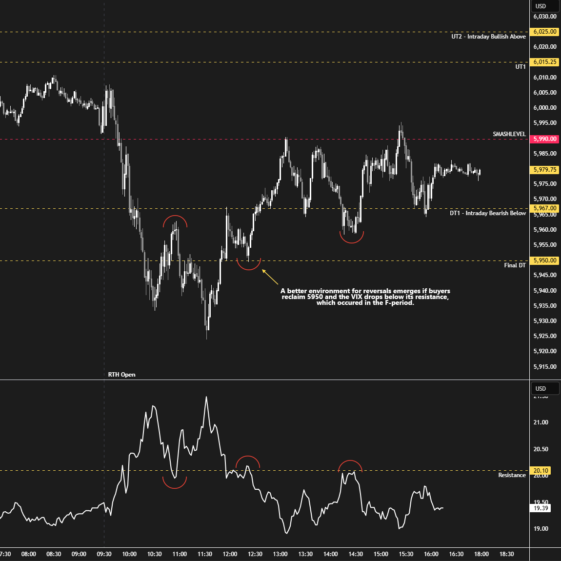 The E-period was tricky, as sellers managed to print a lower low—unlike yesterday’s session. However, this low was quickly rejected as the market formed an excess low. Notably, the weekly support area highlighted in the Weekly Plan, between 5930 and 5900, attracted buyers today. As often mentioned, trading below the final downside target (5950) while the VIX remains above its resistance level (20.10) is not an optimal setup for reversals, as there is potential for further weakness. Reversal setups should only be considered if ES reclaims 5950 while the VIX drops below its resistance—both of which occurred during the F-period when the market retested 5950 almost to the tick. The remainder of the session saw two-sided activity, with the Smashlevel at 5990 capping the upside, marking it as an important level going forward.
