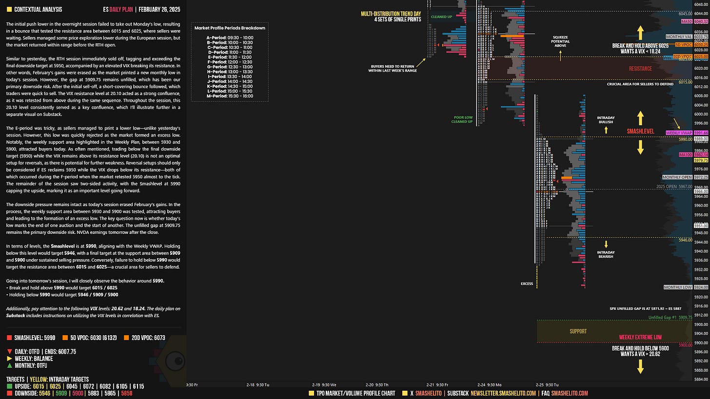 Similar to yesterday, the RTH session immediately sold off, tagging and exceeding the final downside target at 5950, accompanied by an elevated VIX breaking its resistance. In other words, February’s gains were erased as the market printed a new monthly low in today’s session. However, the gap at 5909.75 remains unfilled, which has been our primary downside risk. After the initial sell-off, a short-covering bounce followed, which traders were quick to sell. The VIX resistance level at 20.10 acted as a strong confluence, as it was retested from above during the same sequence. Throughout the session, this 20.10 level consistently served as a key confluence, which I’ll illustrate further in a separate visual on Substack.