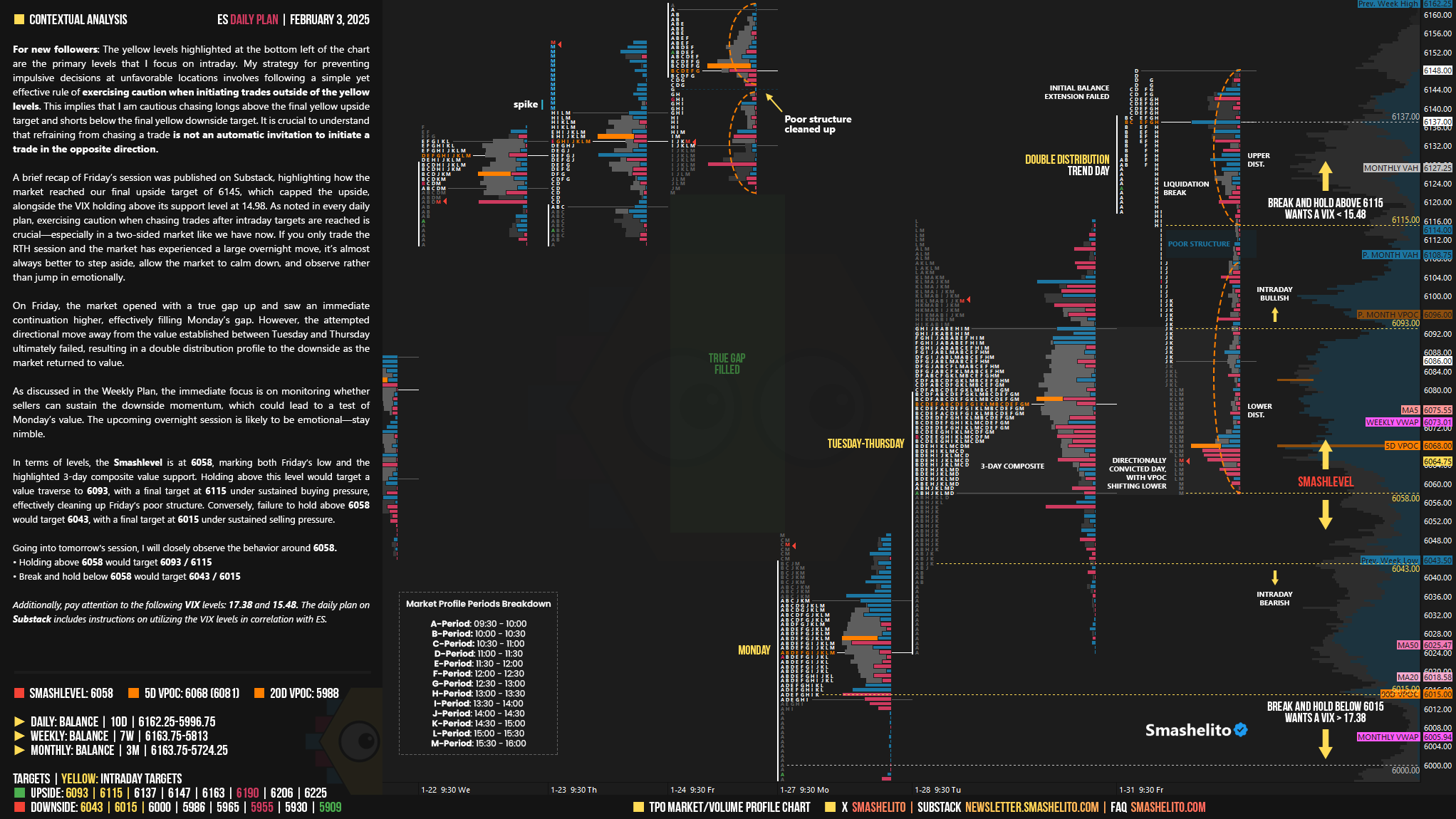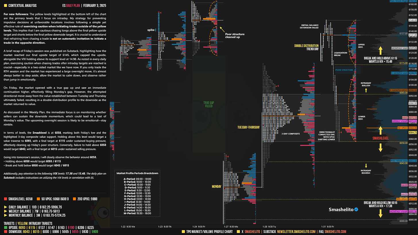 A brief recap of Friday’s session was published on Substack (link), highlighting how the market reached our final upside target of 6145, which capped the upside, alongside the VIX holding above its support level at 14.98. As noted in every daily plan, exercising caution when chasing trades after intraday targets are reached is crucial—especially in a two-sided market like we have now. If you only trade the RTH session and the market has experienced a large overnight move, it’s almost always better to step aside, allow the market to calm down, and observe rather than jump in emotionally.
