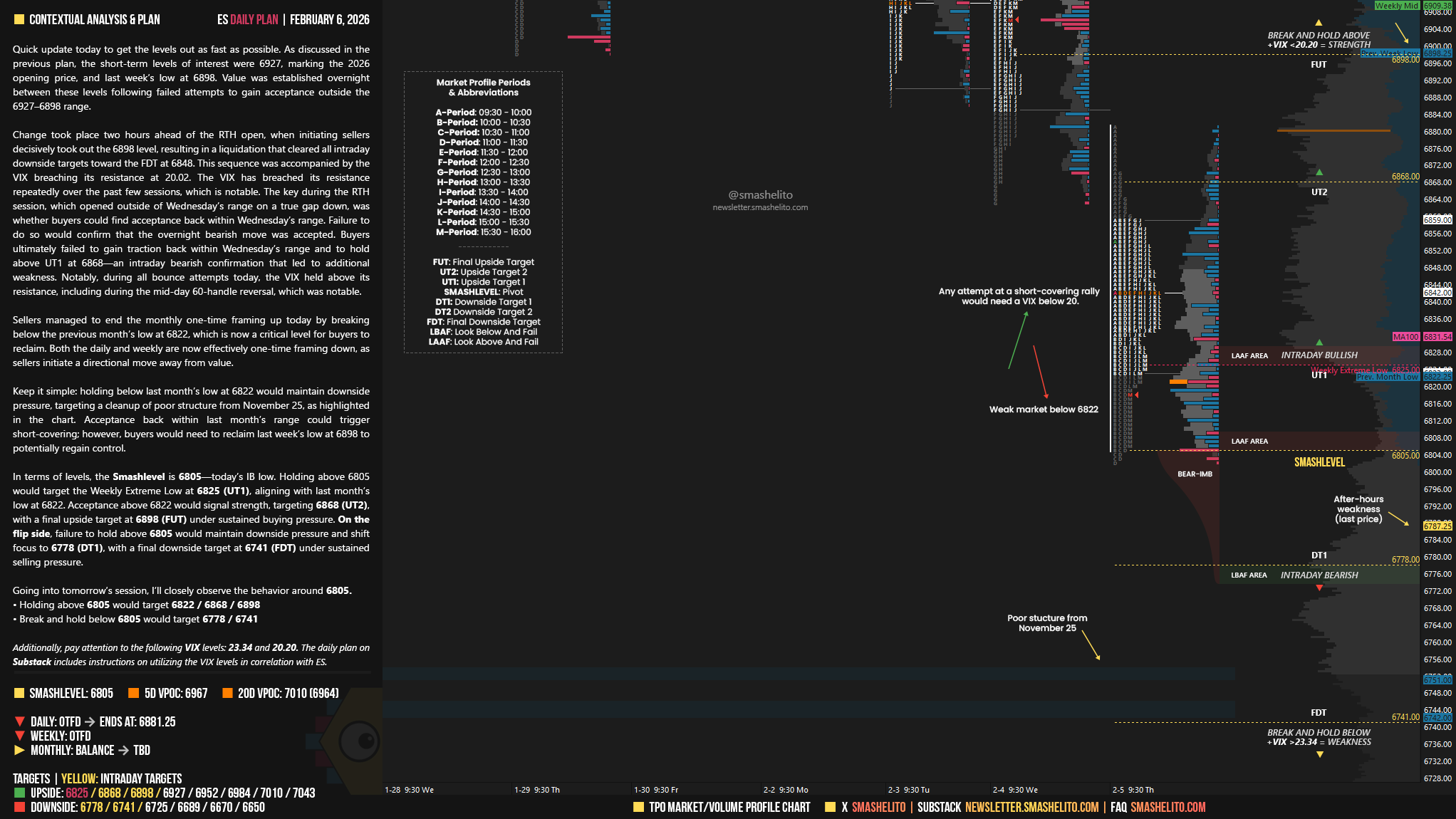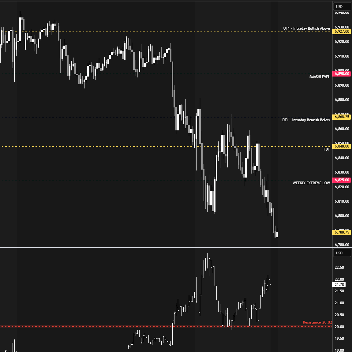 In terms of levels, the Smashlevel is 6805—today’s IB low. Holding above 6805 would target the Weekly Extreme Low at 6825 (UT1), aligning with last month’s low at 6822. Acceptance above 6822 would signal strength, targeting 6868 (UT2), with a final upside target at 6898 (FUT) under sustained buying pressure.