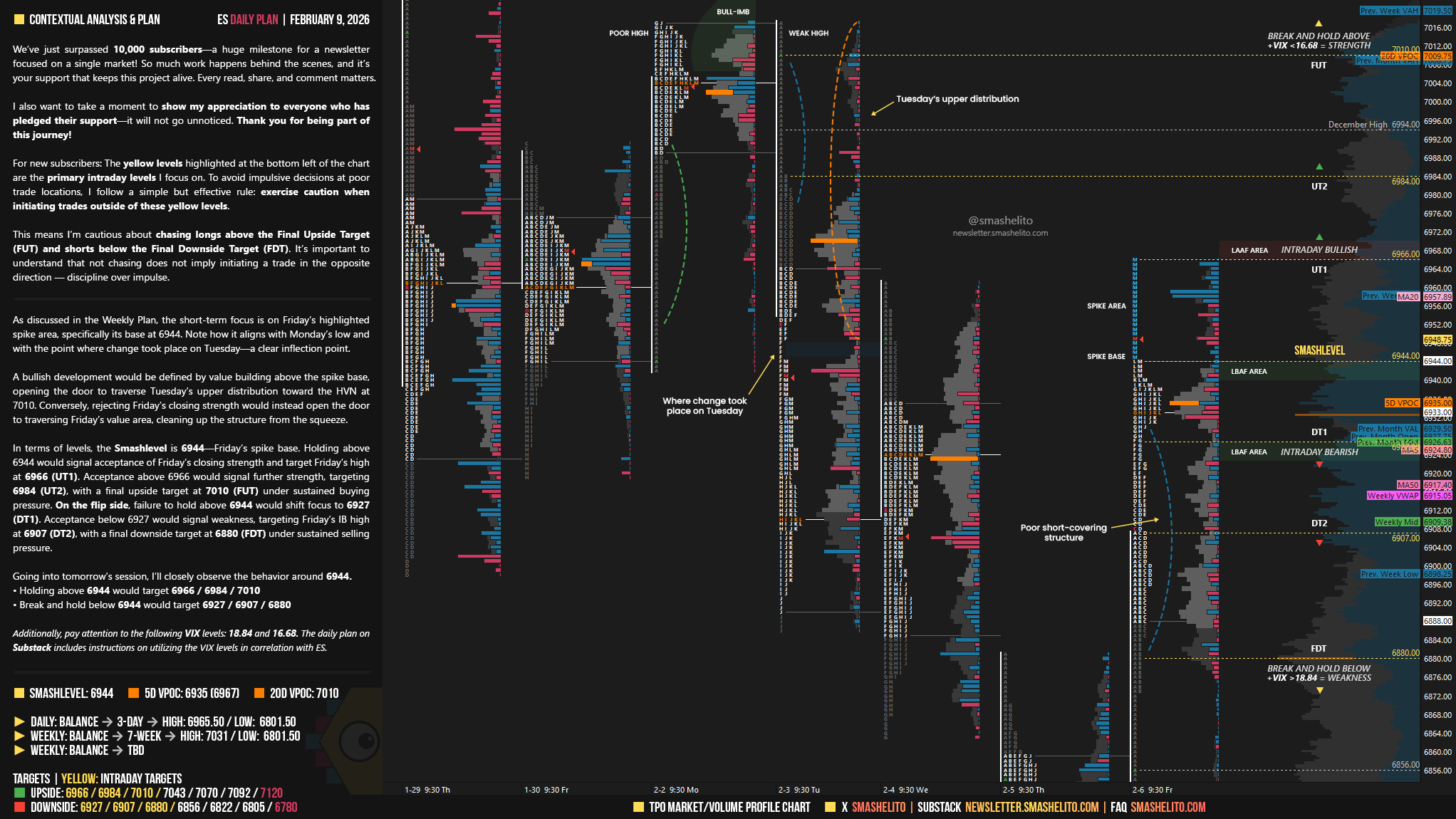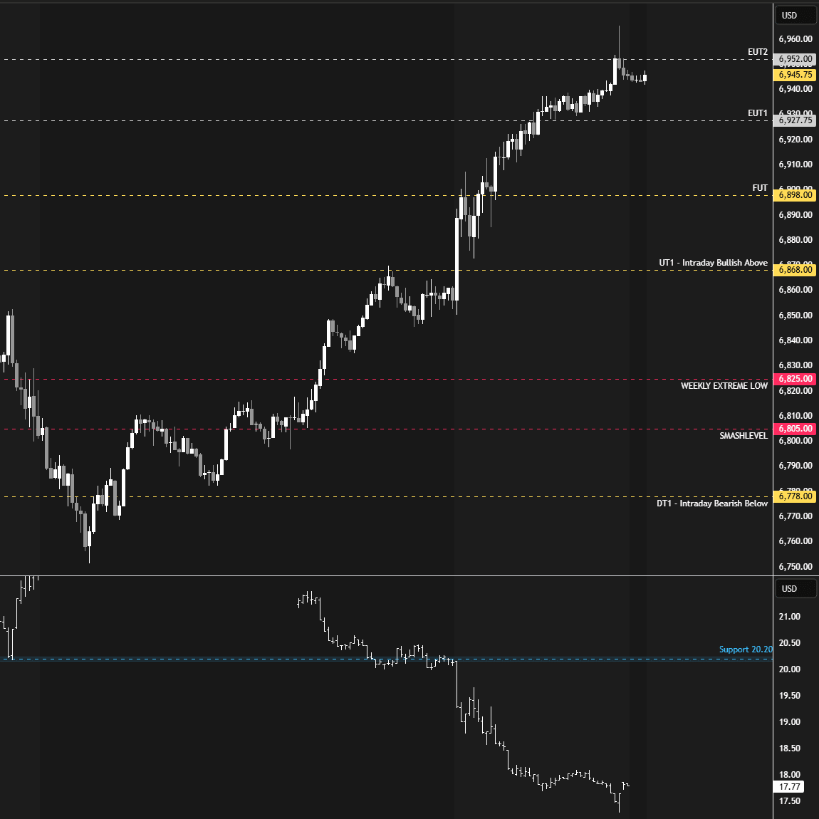 In terms of levels, the Smashlevel is 6944—Friday’s spike base. Holding above 6944 would signal acceptance of Friday’s closing strength and target Friday’s high at 6966 (UT1). Acceptance above 6966 would signal further strength, targeting 6984 (UT2), with a final upside target at 7010 (FUT) under sustained buying pressure.