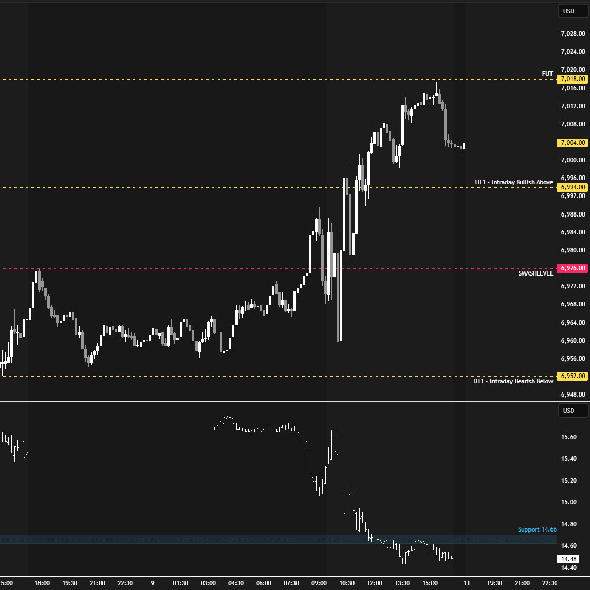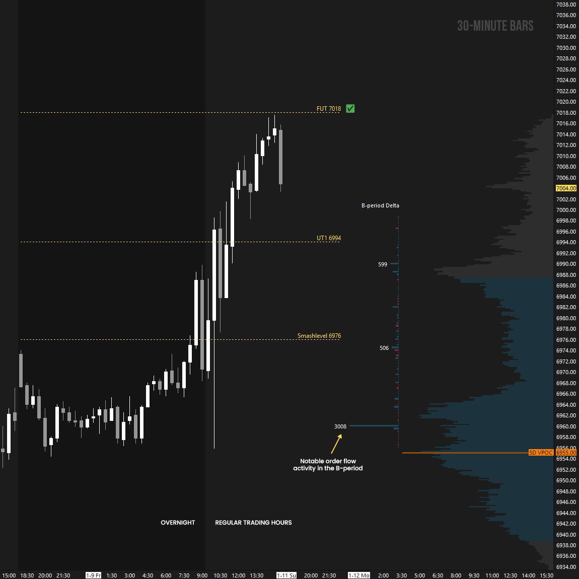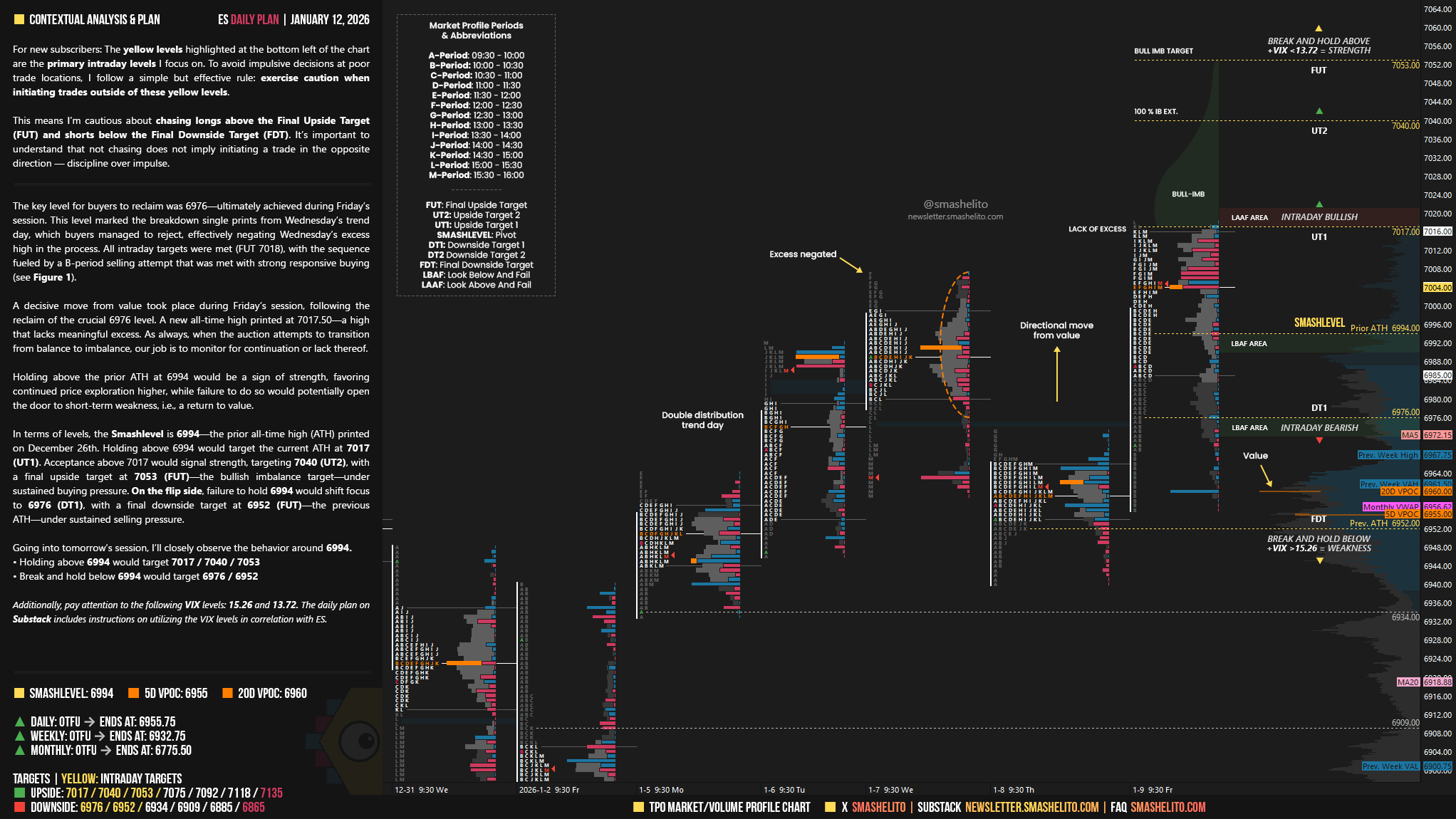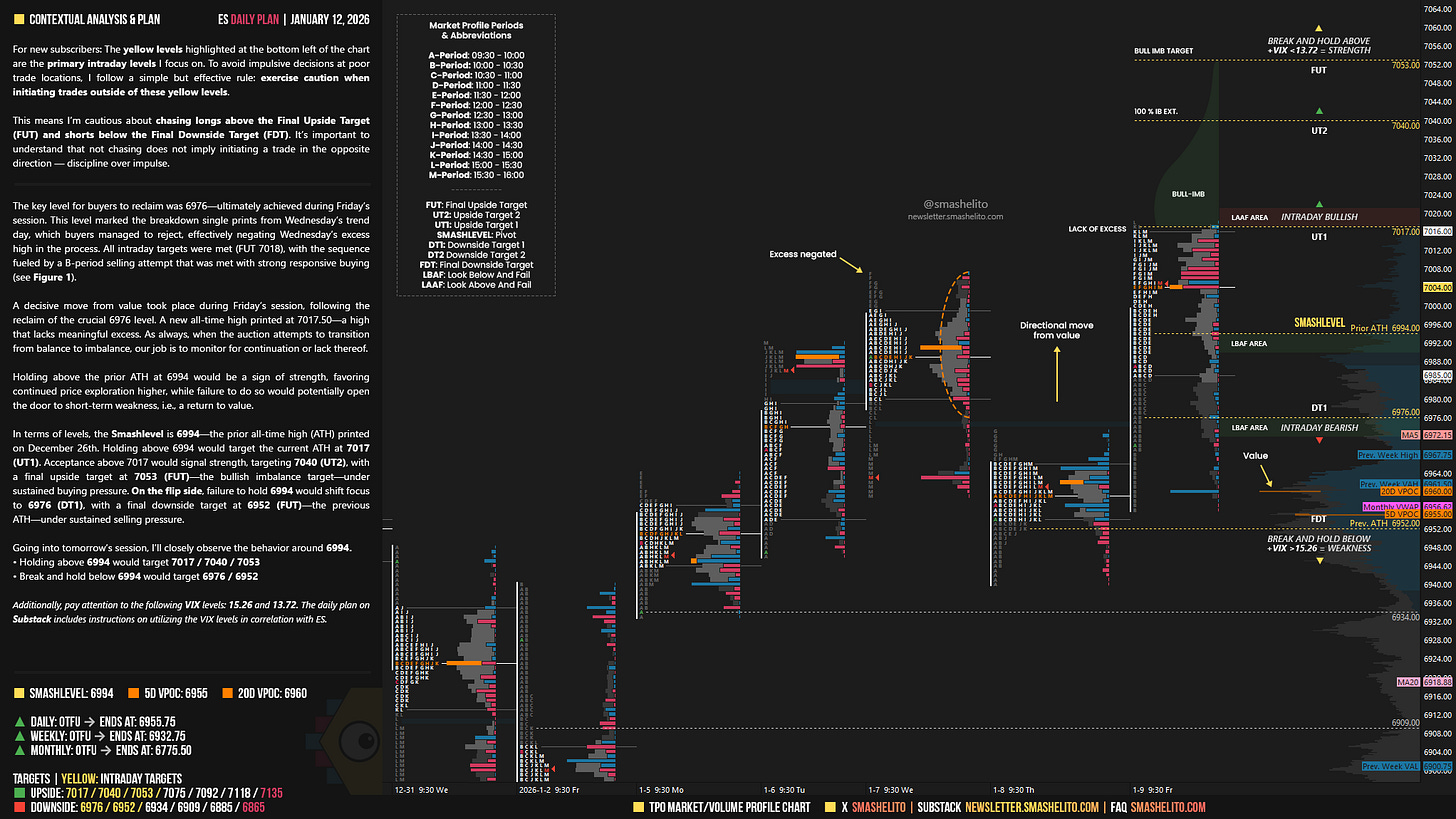 In terms of levels, the Smashlevel is 6994—the prior all-time high (ATH) printed on December 26th. Holding above 6994 would target the current ATH at 7017 (UT1). Acceptance above 7017 would signal strength, targeting 7040 (UT2), with a final upside target at 7053 (FUT)—the bullish imbalance target—under sustained buying pressure.
