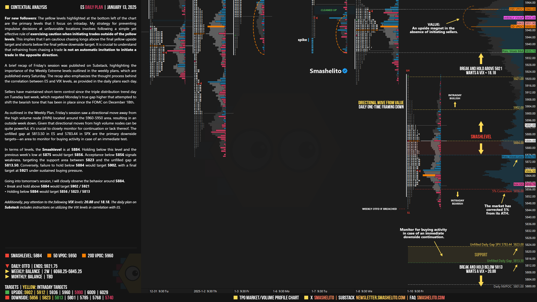 As outlined in the Weekly Plan, Friday's session saw a directional move away from the high volume node (HVN) located around the 5960-5950 area, resulting in an outside week down. Given that directional moves from high volume nodes can be quite powerful, it's crucial to closely monitor for continuation or lack thereof. The unfilled gap at 5813.50 in ES and 5783.44 in SPX are the primary downside targets—an area to monitor for buying activity in case of an immediate test.