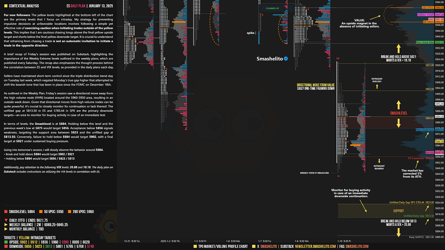 A brief recap of Friday’s session was published on Substack (link), highlighting the importance of the Weekly Extreme levels outlined in the weekly plans, which are published every Saturday. The recap also emphasizes the thought process behind the correlation between ES and VIX levels, as provided in the daily plans each day.