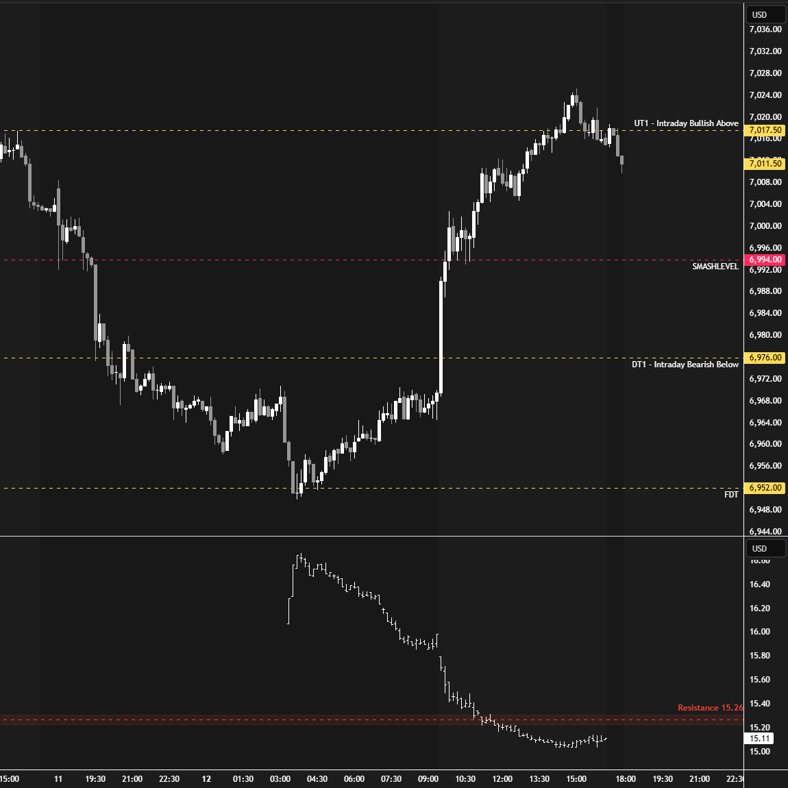 On the flip side, reclaiming and holding above 7017 would shift focus to the 100% IB extension at 7036 (UT1). Acceptance above 7036 would signal strength, targeting 7053 (UT2), with a final upside target at 7070 (FUT)—the 200% IB extension—under sustained buying pressure.