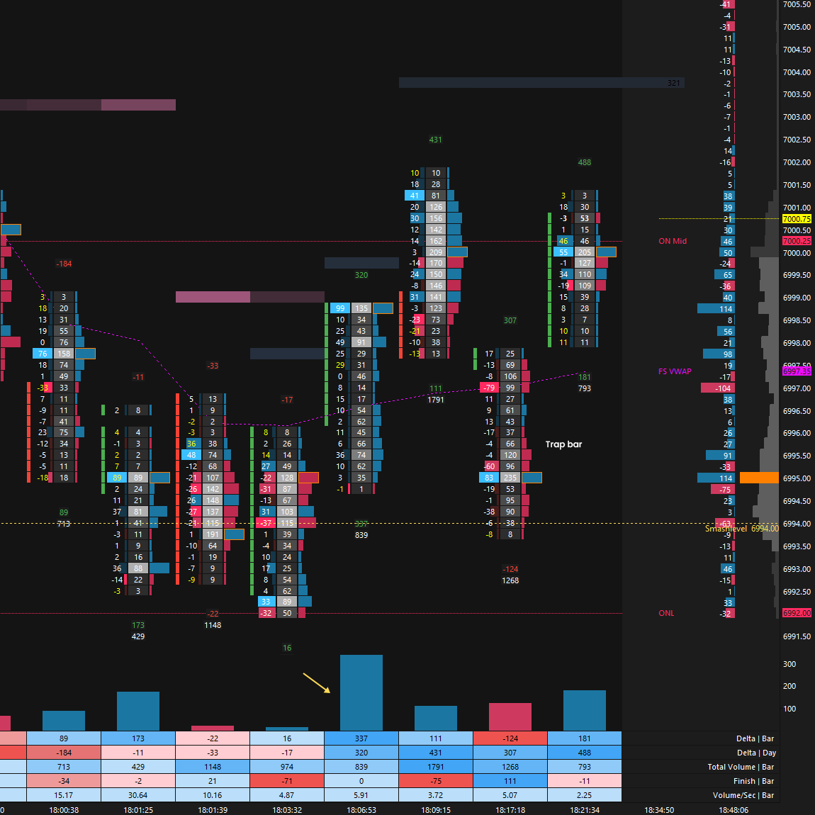 Today’s session offered great opportunities through reactions around our identified key levels. The overnight session kicked off with immediate weakness, testing the Smashlevel at 6994, where buying activity emerged—confirming that this area was not only important for us, but for other market participants as well (see Figure 1). While buyers initially stepped in at 6994, they were unable to follow through to the upside. After one too many tests, 6994 was breached, triggering a wave of stops, evident in the increase in pace. Failure to hold 6994 opened the door to a return to value—a scenario that played out overnight, as the market tagged the final downside target at 6952 (FDT). A return to value signaled that the downside sequence was complete, making 6952 an unfavorable level to initiate new shorts. Those who did so entered at poor location and were quickly punished.
