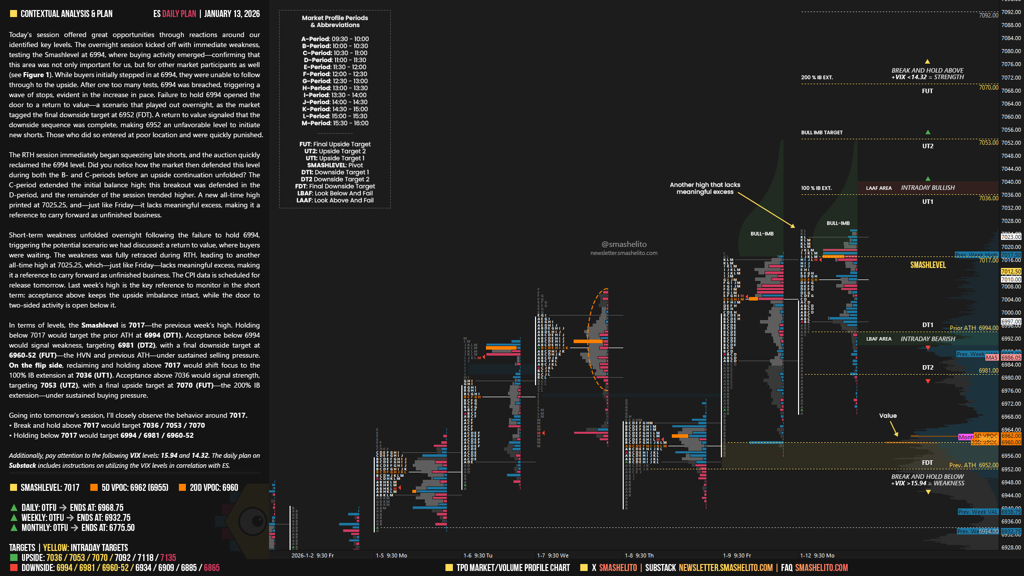 In terms of levels, the Smashlevel is 7017—the previous week’s high. Holding below 7017 would target the prior ATH at 6994 (DT1). Acceptance below 6994 would signal weakness, targeting 6981 (DT2), with a final downside target at 6960-52 (FUT)—the HVN and previous ATH—under sustained selling pressure.