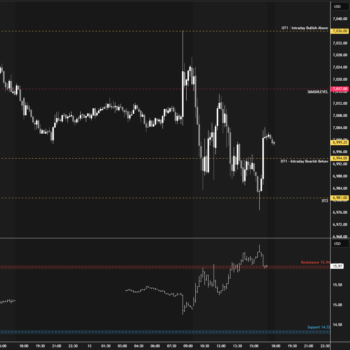 Break and hold above 7053 with VIX below 15.16 would confirm strength.