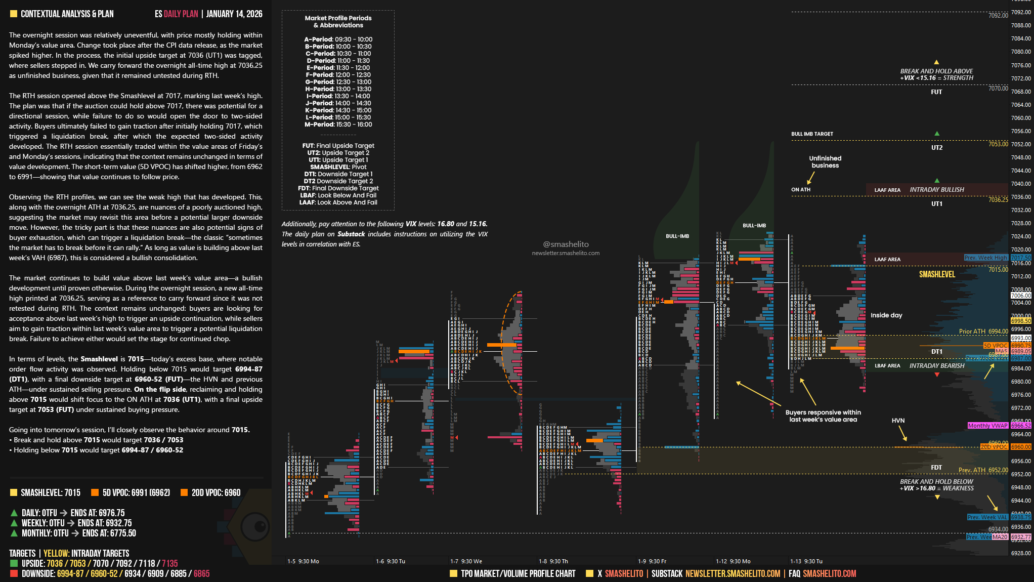 The RTH session opened above the Smashlevel at 7017, marking last week’s high. The plan was that if the auction could hold above 7017, there was potential for a directional session, while failure to do so would open the door to two-sided activity. Buyers ultimately failed to gain traction after initially holding 7017, which triggered a liquidation break, after which the expected two-sided activity developed. The RTH session essentially traded within the value areas of Friday’s and Monday’s sessions, indicating that the context remains unchanged in terms of value development. The short-term value (5D VPOC) has shifted higher, from 6962 to 6991—showing that value continues to follow price.