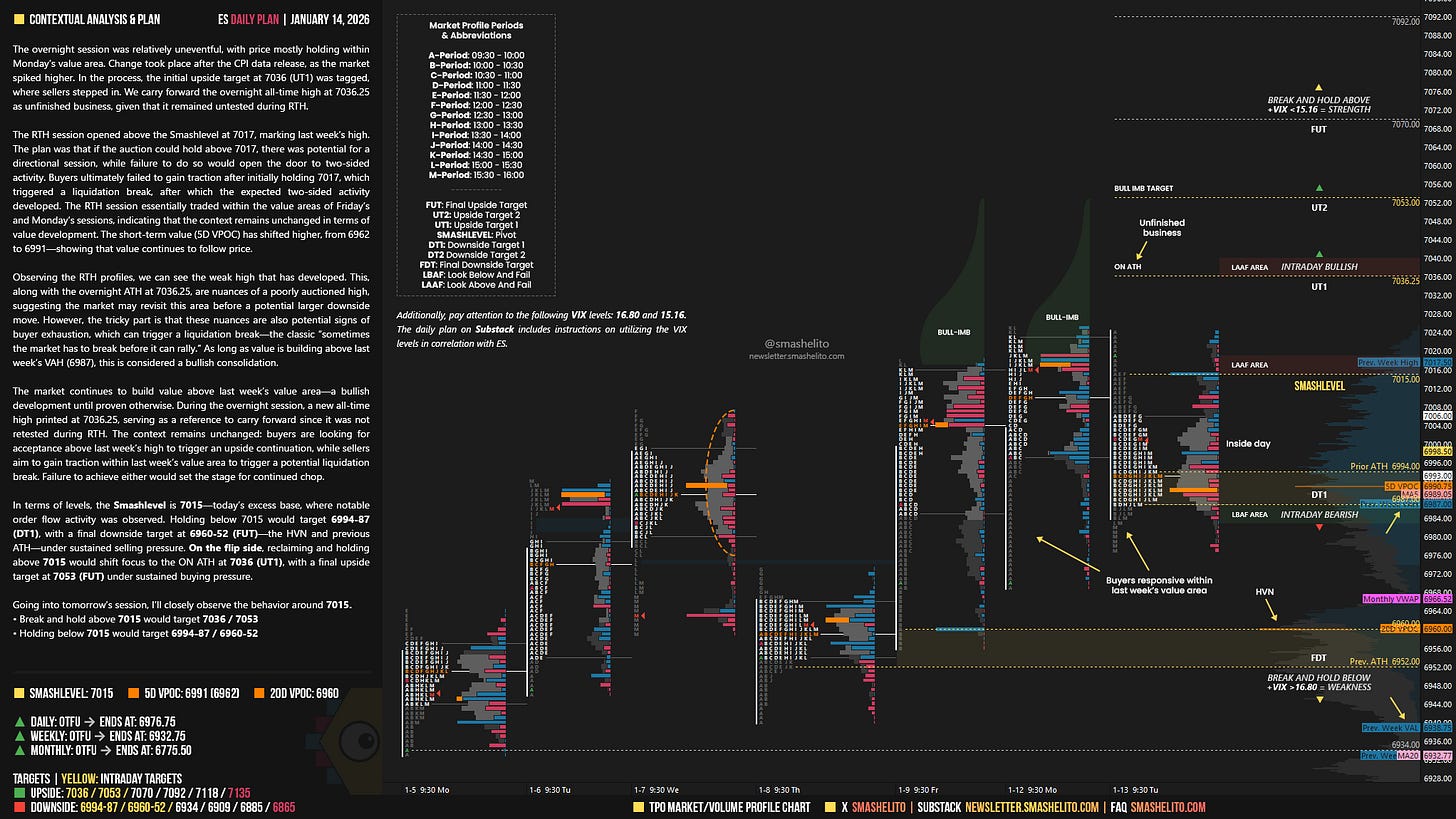 The market continues to build value above last week’s value area—a bullish development until proven otherwise. During the overnight session, a new all-time high printed at 7036.25, serving as a reference to carry forward since it was not retested during RTH. The context remains unchanged: buyers are looking for acceptance above last week’s high to trigger an upside continuation, while sellers aim to gain traction within last week’s value area to trigger a potential liquidation break. Failure to achieve either would set the stage for continued chop.