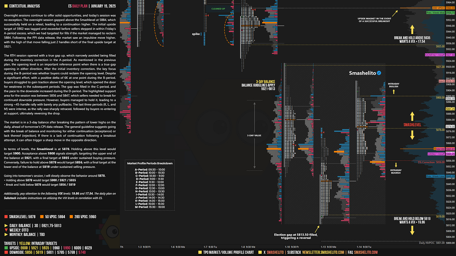 Overnight sessions continue to offer solid opportunities, and today’s session was no exception. The overnight session gapped above the Smashlevel at 5884, which successfully held on a retest, leading to a continuation higher. The initial upside target of 5902 was tagged and exceeded before sellers stepped in within Friday’s A-period excess, which we had targeted for fills if the market managed to reclaim 5884. Following the PPI data release, the market saw an impulsive move higher, with the high of that move falling just 2 handles short of the final upside target at 5921.