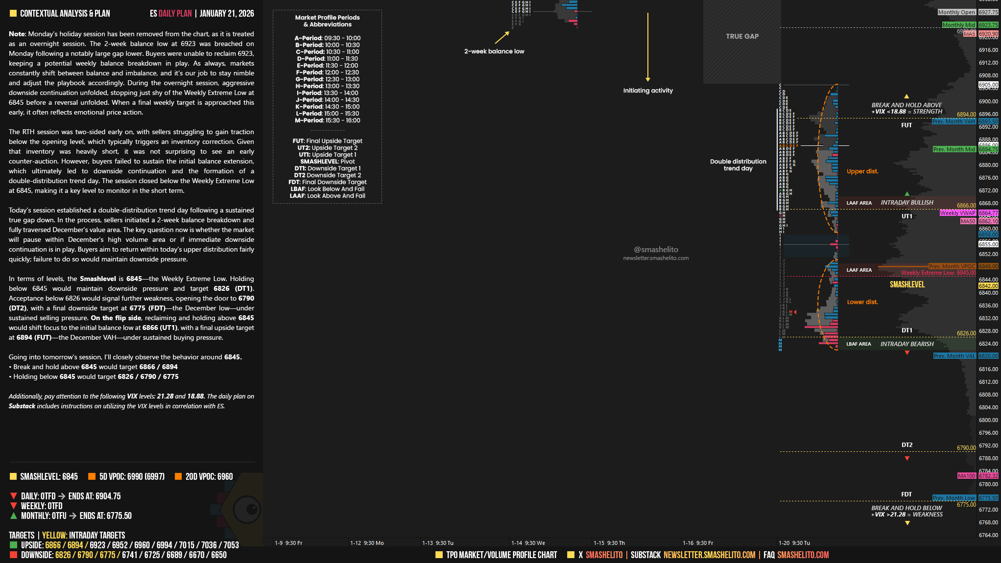 Note: Monday’s holiday session has been removed from the chart, as it is treated as an overnight session. The 2-week balance low at 6923 was breached on Monday following a notably large gap lower. Buyers were unable to reclaim 6923, keeping a potential weekly balance breakdown in play. As always, markets constantly shift between balance and imbalance, and it’s our job to stay nimble and adjust the playbook accordingly. During the overnight session, aggressive downside continuation unfolded, stopping just shy of the Weekly Extreme Low at 6845 before a reversal unfolded. When a final weekly target is approached this early, it often reflects emotional price action.