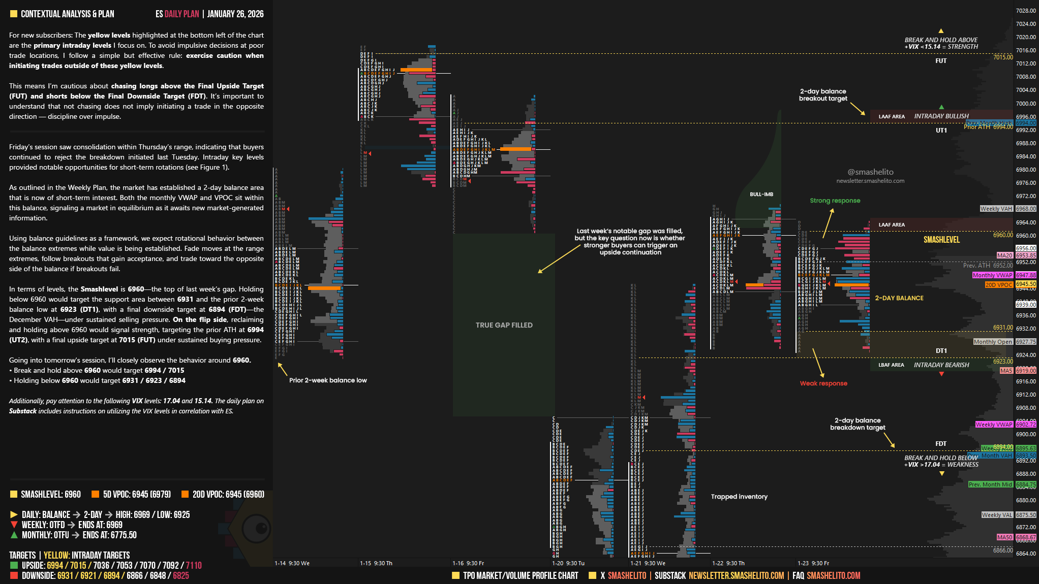 In terms of levels, the Smashlevel is 6960—the top of last week’s gap. Holding below 6960 would target the support area between 6931 and the prior 2-week balance low at 6923 (DT1), with a final downside target at 6894 (FDT)—the December VAH—under sustained selling pressure.