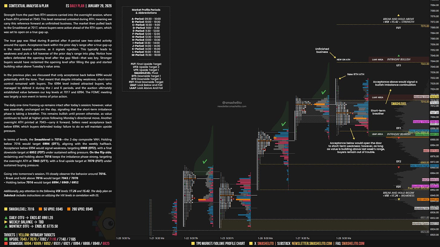 Strength from the past two RTH sessions carried into the overnight session, where a fresh ATH printed at 7043. This level remained untested during RTH, meaning we carry this reference forward as unfinished business. The market then pulled back to the Smashlevel at 7017, where buyers were active ahead of the RTH open, which was set to open on a true gap up.