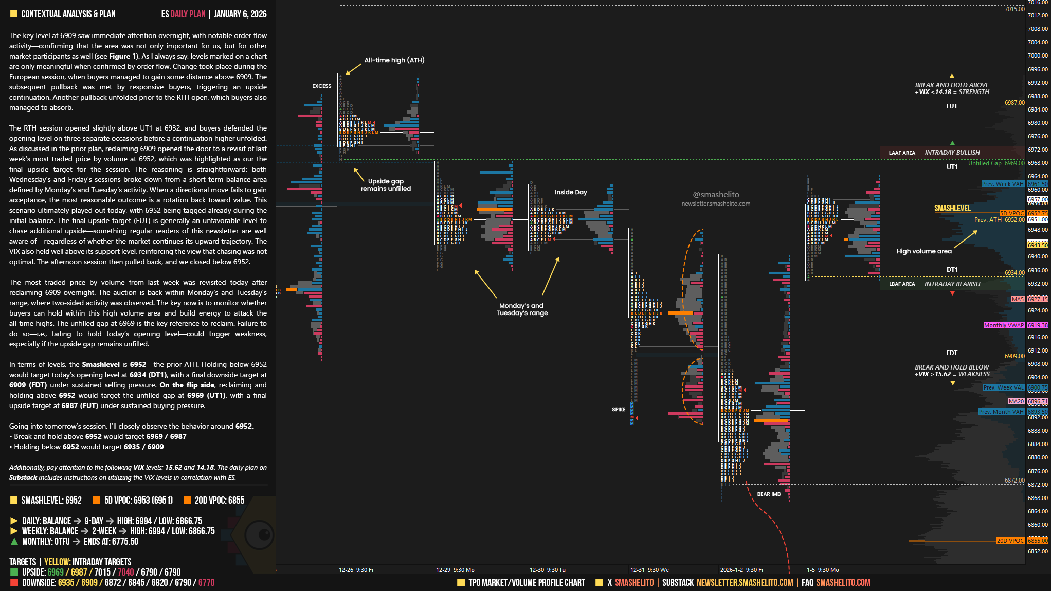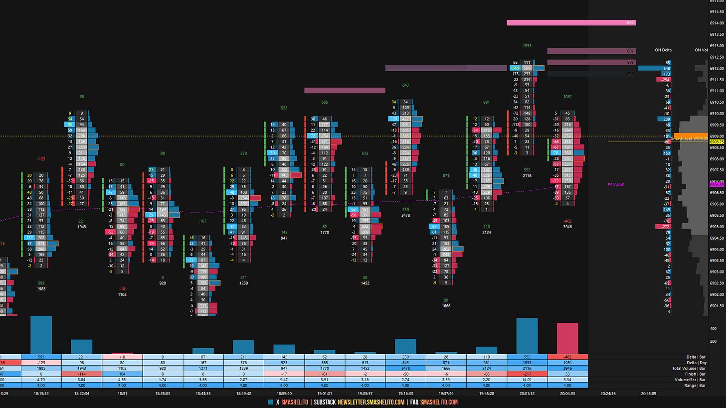 The RTH session opened slightly above UT1 at 6932, and buyers defended the opening level on three separate occasions before a continuation higher unfolded. As discussed in the prior plan, reclaiming 6909 opened the door to a revisit of last week’s most traded price by volume at 6952, which was highlighted as our the final upside target for the session.