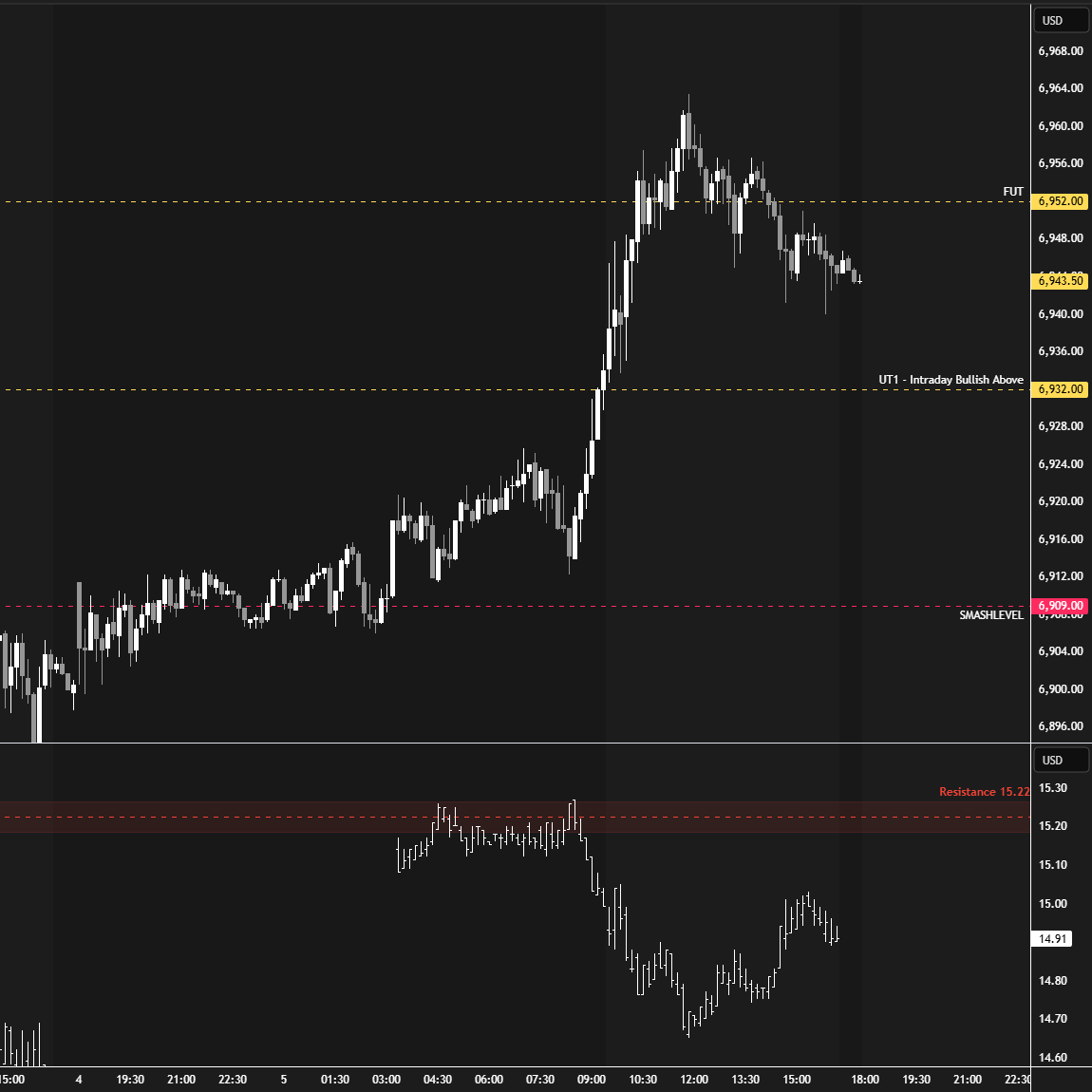 The yellow levels highlighted at the bottom left of the chart are the primary intraday levels I focus on. To avoid impulsive decisions at poor trade locations, I follow a simple but effective rule: exercise caution when initiating trades outside of these yellow levels.