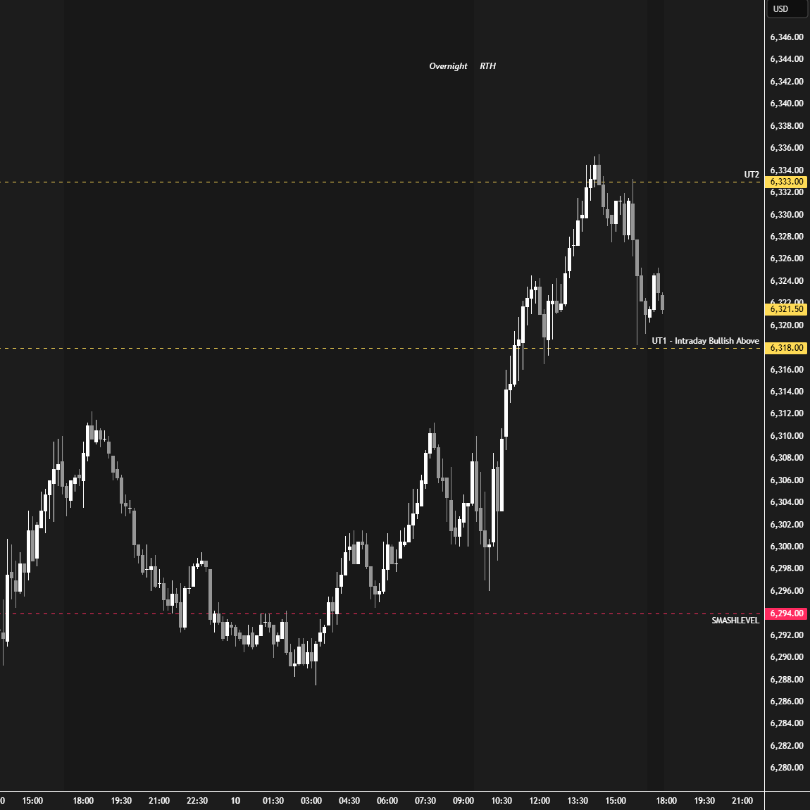 In terms of levels, the Smashlevel is at 6315. Holding above 6315 would target the prior all-time high at 6333 (UT1). Acceptance above 6333 would signal strength, targeting 6355 (UT2), with a final upside target (FUT) at 6375 under sustained buying pressure.