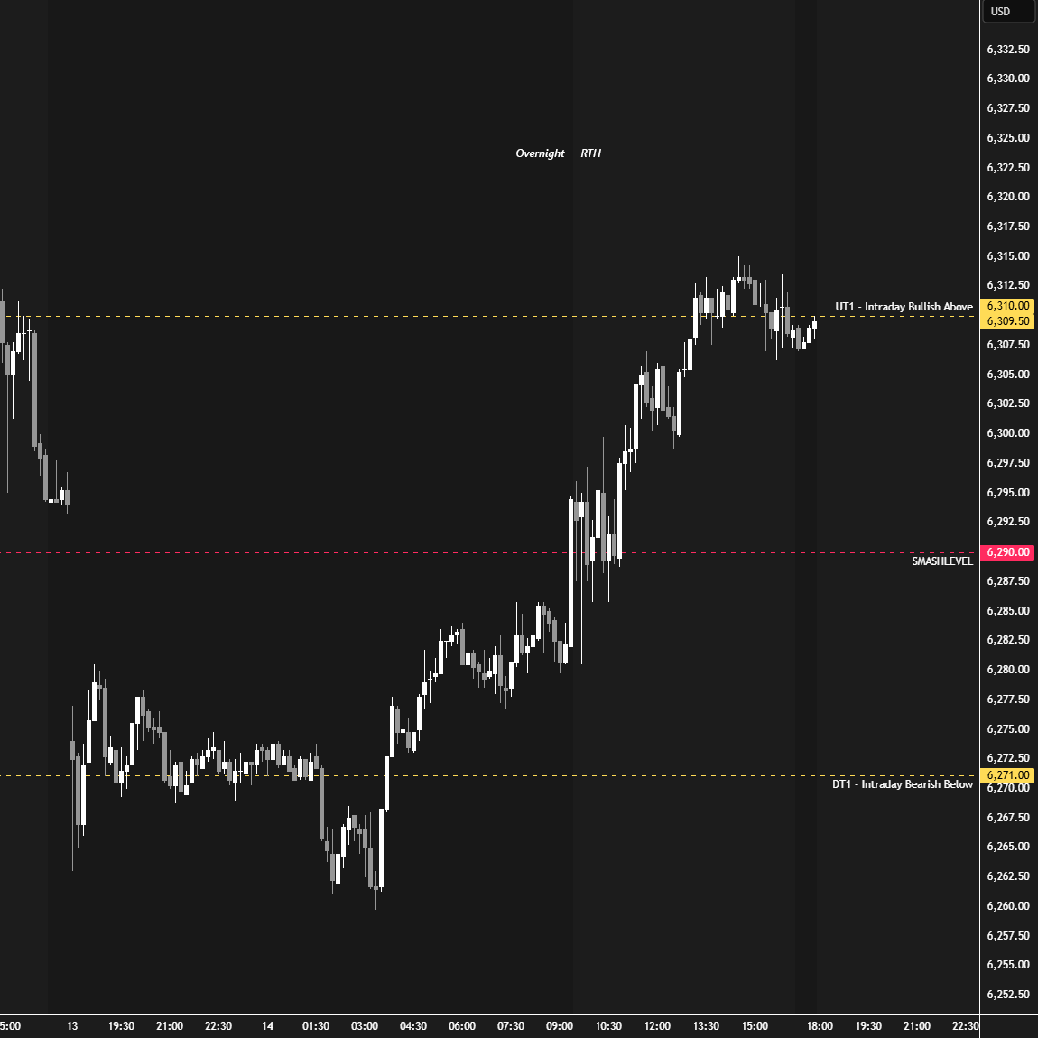 In terms of levels, the Smashlevel is at 6314—today’s value resistance. Holding below 6314 would target today’s value support at 6295 (DT1). Acceptance below 6295 would signal weakness, targeting high volume node (HVN) at 6271 (DT2), with a final downside target (FDT) at 6246—the lower end of the 6-day balance area—under sustained selling pressure.
