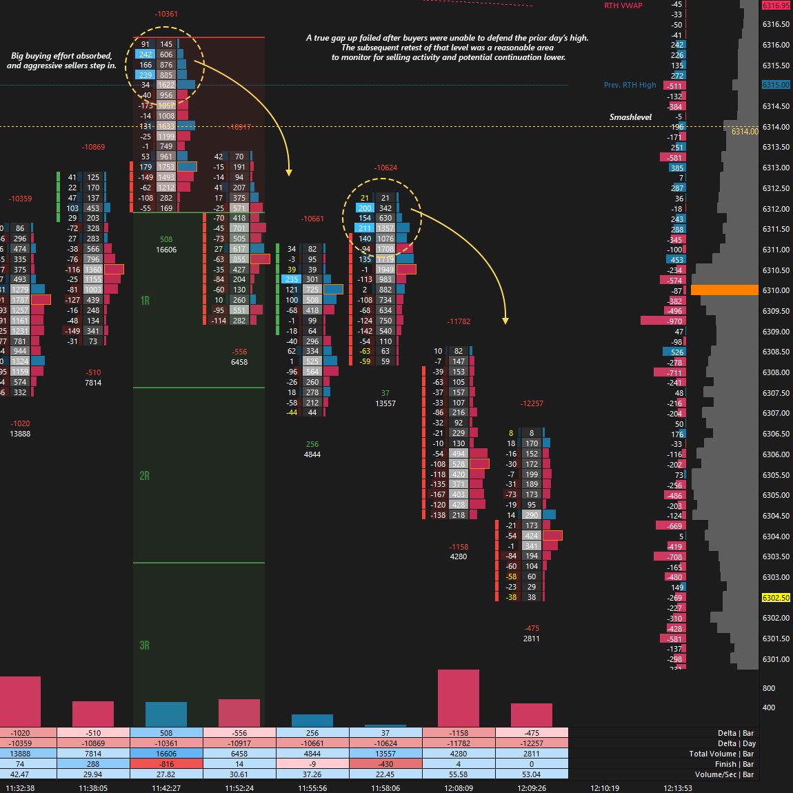 Balance guidelines are arguably one of the most important concepts to have in your trading arsenal. The RTH session opened with a true gap up—not only outside the previous day’s range, but also above the 6-day balance area. When the market opens with a true gap in either direction, it signals a shift in tone relative to the previous session. It’s our job to monitor whether that change is accepted or rejected.