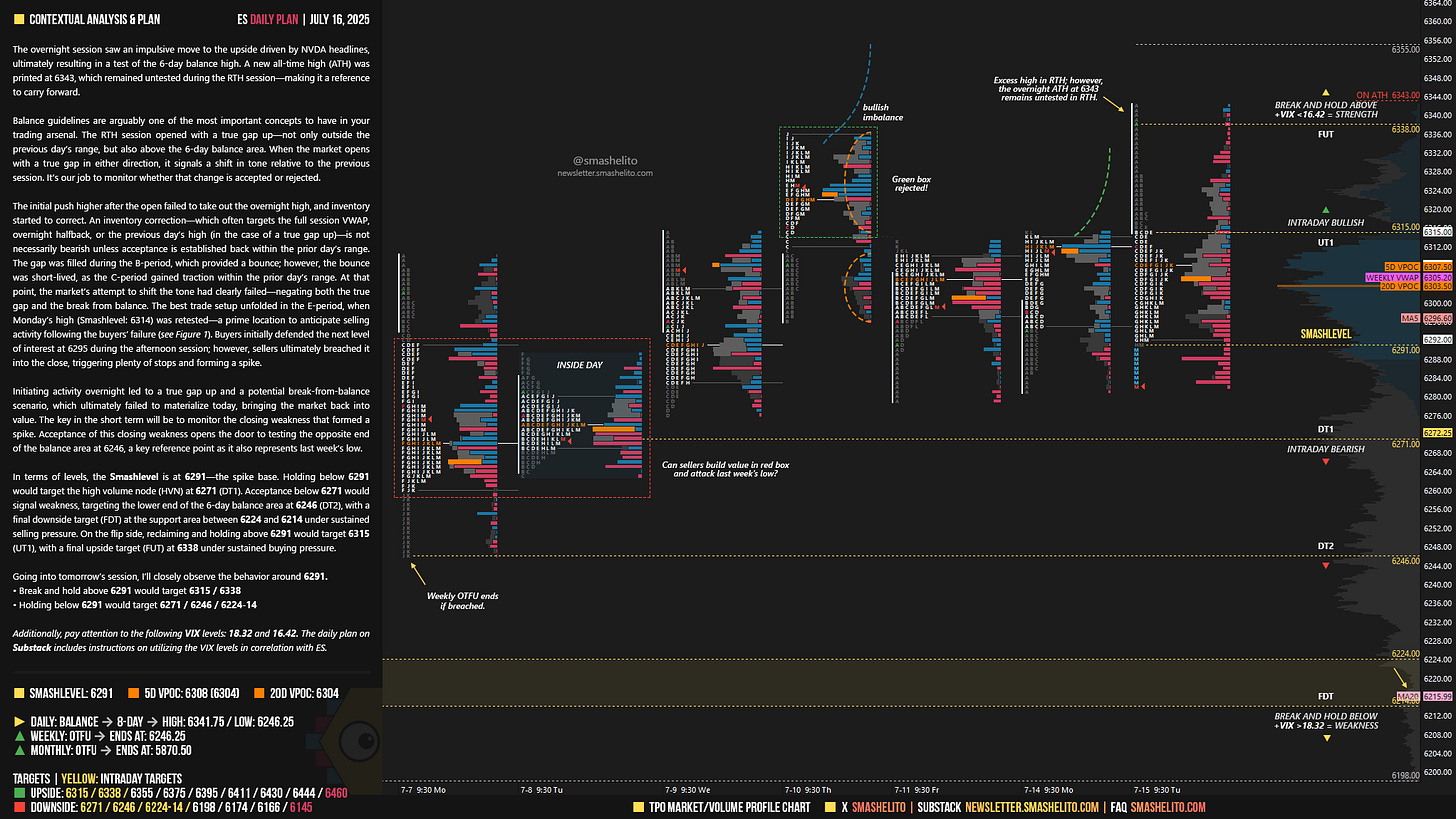 Be sure to review the ES Weekly Plan | July 14-18, 2025 for a broader perspective, key levels, and market expectations for the week ahead.