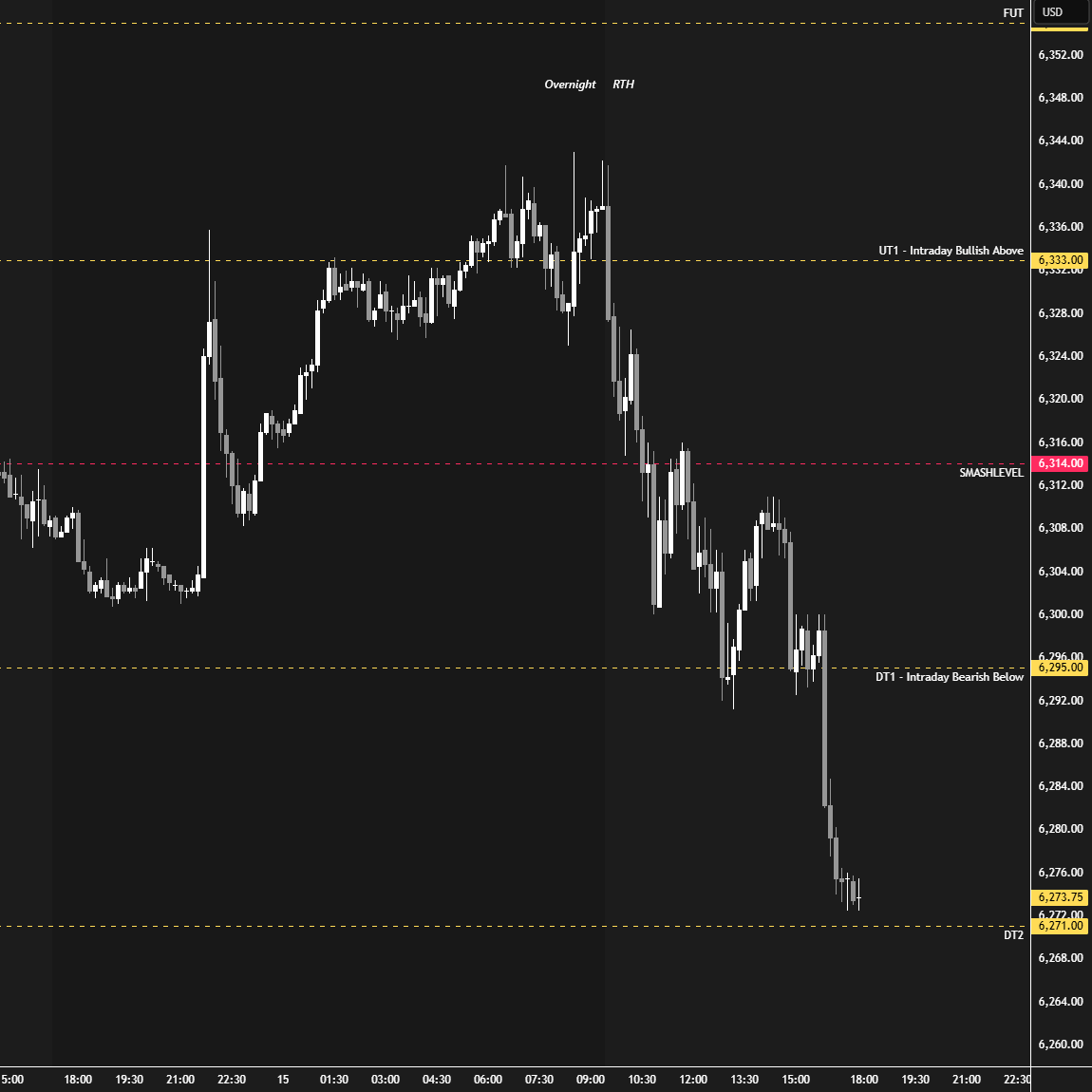 In terms of levels, the Smashlevel is at 6291—the spike base. Holding below 6291 would target the high volume node (HVN) at 6271 (DT1). Acceptance below 6271 would signal weakness, targeting the lower end of the 6-day balance area at 6246 (DT2), with a final downside target (FDT) at the support area between 6224 and 6214 under sustained selling pressure.