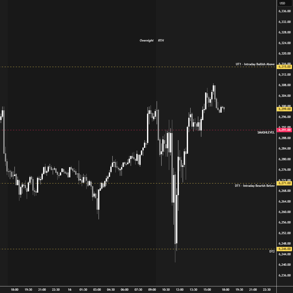 In terms of levels, the Smashlevel is at 6291—Tuesday’s spike base, which aligns with today’s afternoon pullback low. Holding above 6291 would target 6315 (UT1). Acceptance above 6315 would signal strength, targeting 6338 (UT2), with a final upside target (FUT) at 6355 under sustained buying pressure.
