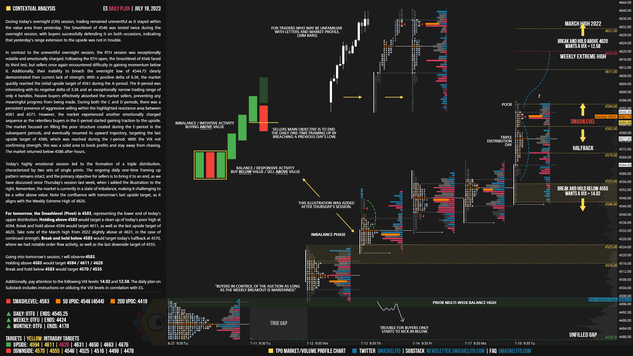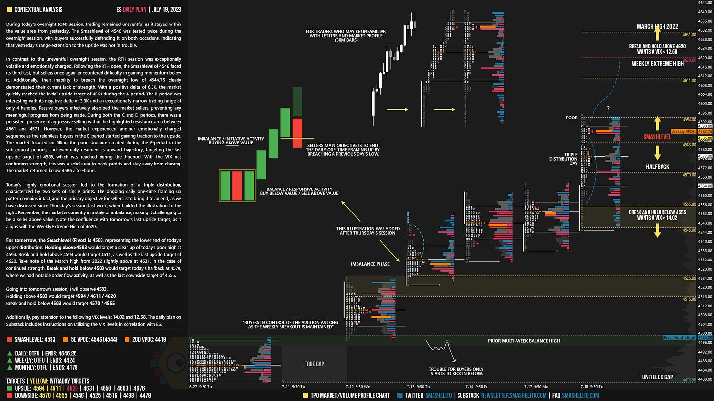Today's highly emotional session led to the formation of a triple distribution, characterized by two sets of single prints. The ongoing daily one-time framing up pattern remains intact, and the primary objective for sellers is to bring it to an end, as we have discussed since Thursday’s session last week, when I added the illustration to the right. Remember, the market is currently in a state of imbalance, making it challenging to be a seller above value. Note the confluence with tomorrow's last upside target, as it aligns with the Weekly Extreme High of 4620.