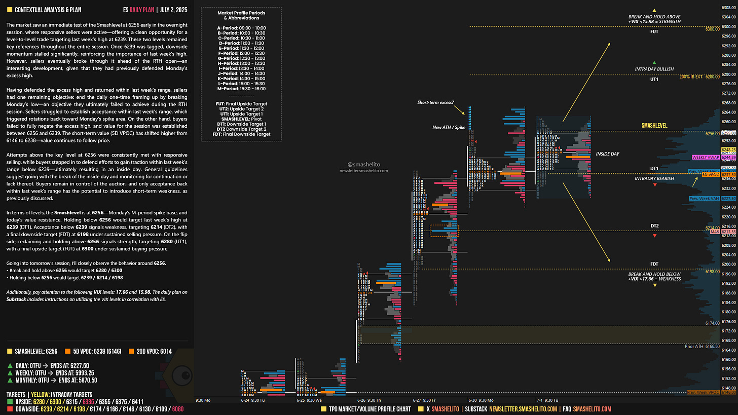 Be sure to review the ES Weekly Plan | June 30 - July 4 for a broader perspective, key levels, and market expectations for the week ahead.