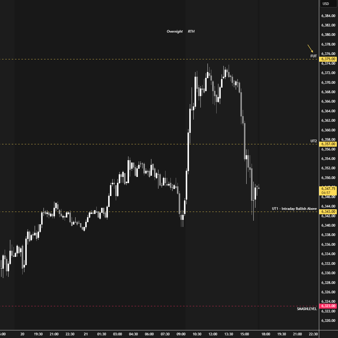 “A strong market would either ignore Friday’s poor low altogether or show little interest in Thursday’s lower distribution if that area is revisited.” The overnight session completely ignored Friday’s poor low, suggesting that Friday’s price action was driven more by weak longs being flushed than by stronger sellers taking control. The initial upside target at 6343 (UT1) was quickly tagged, where price briefly stalled before a full traverse of Thursday’s upper distribution unfolded. For patient buyers, the market offered a pullback toward the 6343 level ahead of the RTH open, where buyers were active.