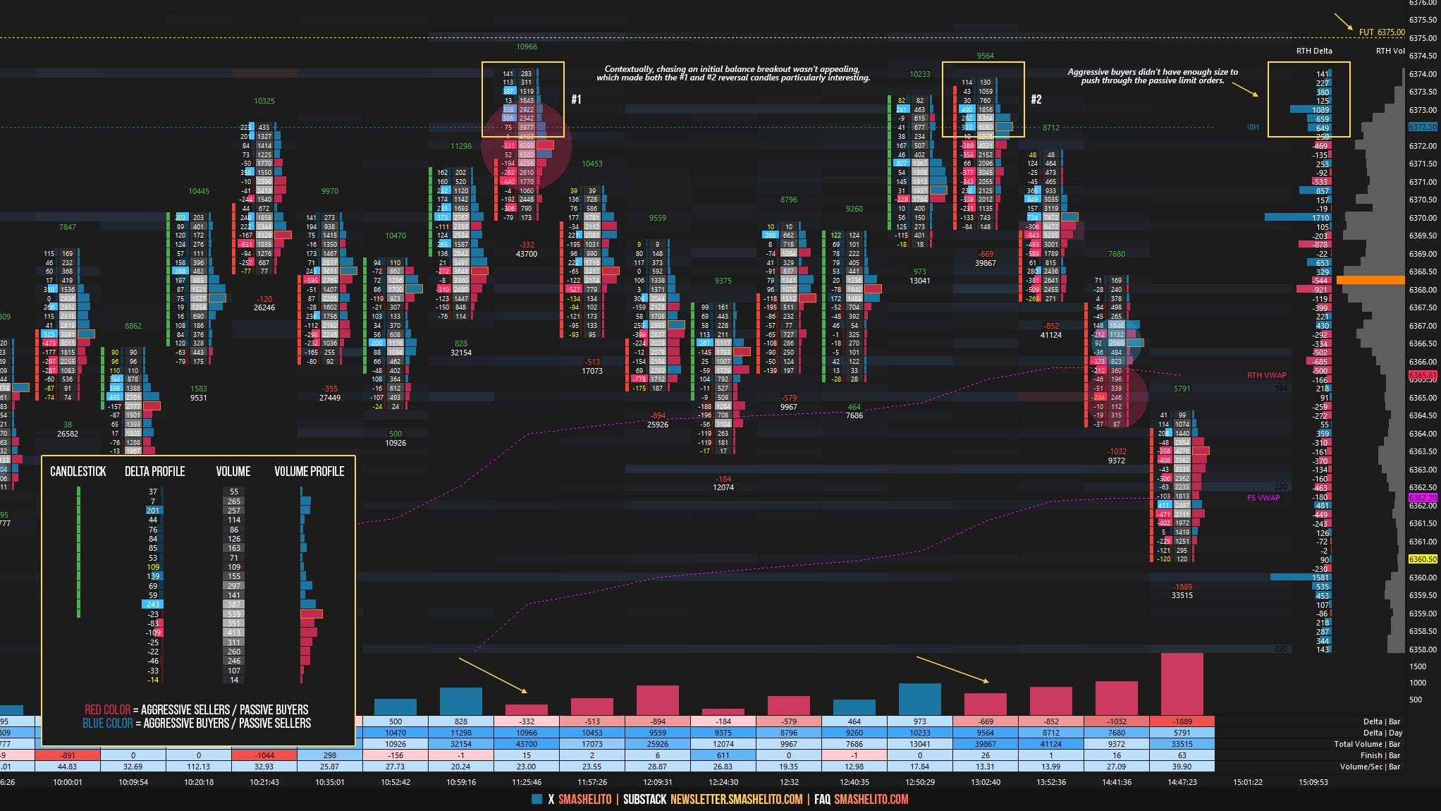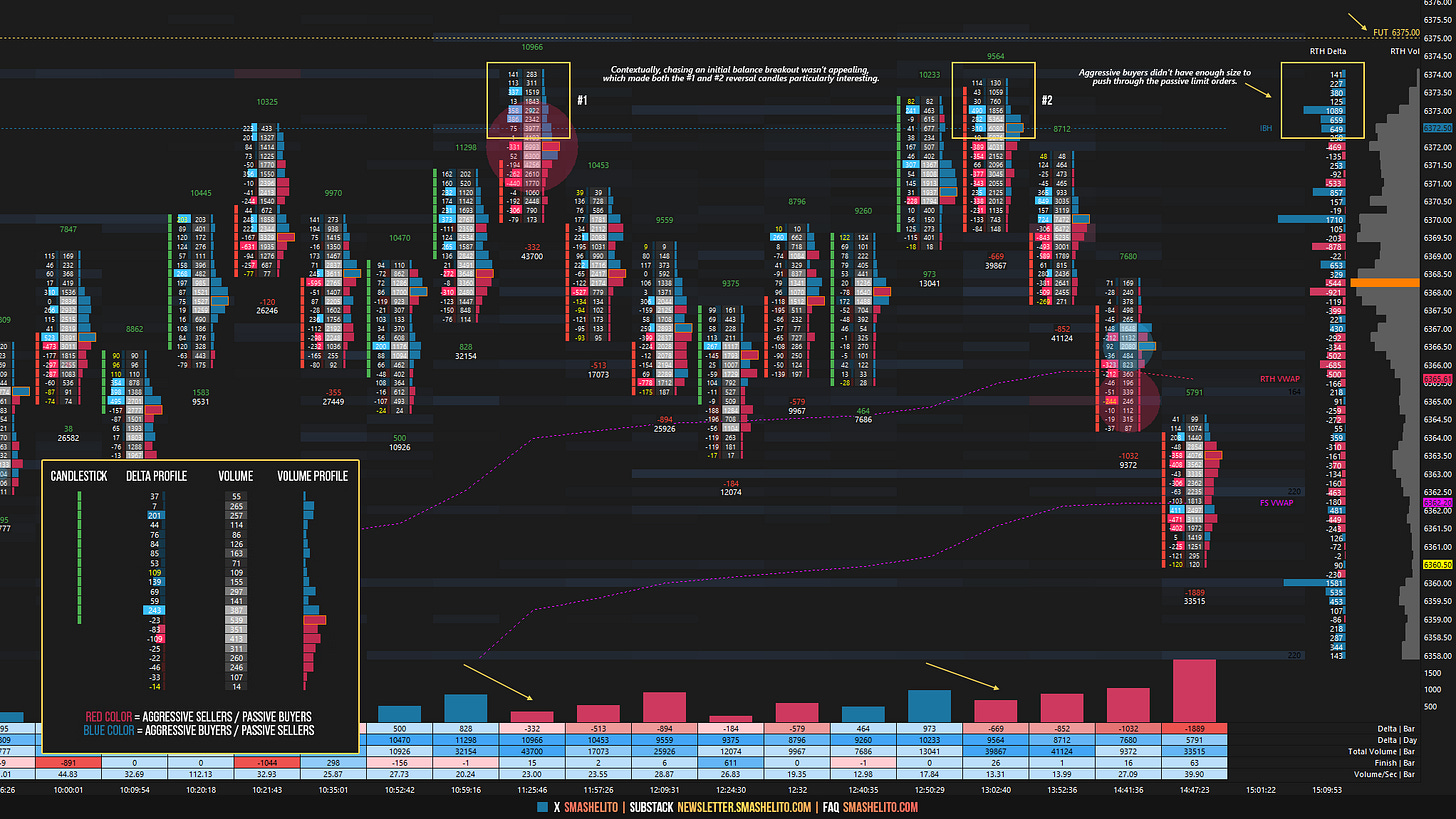 The RTH session, which opened above Friday’s lower distribution—an area marked by notable aggressive selling (see delta profile)—kicked off with a squeeze that printed new all-time highs, cleaning up the overnight ATH (6357) in the process. The final upside target was 6375, essentially tagged during the initial balance (IBH: 6372.50). Note the relatively wide initial balance range of 28 handles, highlighted by a white vertical line along the daily profiles on the chart. A wide IB typically sets the stage for rotational activity if the market struggles to gain traction outside of the IB range. The interesting nuance here was that the final upside target was right at the initial balance high, raising the question: how appealing was it to chase a potential IB extension? Not very, in my book. If we weren’t interested in chasing longs, what did we want to see to be part of potential shorts playing a reversal? That’s right—aggressive buying effort failing to push price higher (absorption), followed by aggressive sellers stepping in. Contextual awareness is the most important factor in trading. I’ll share a visual on Substack illustrating how today’s price action above the initial balance range appeared from an order flow perspective (see Figure 1).