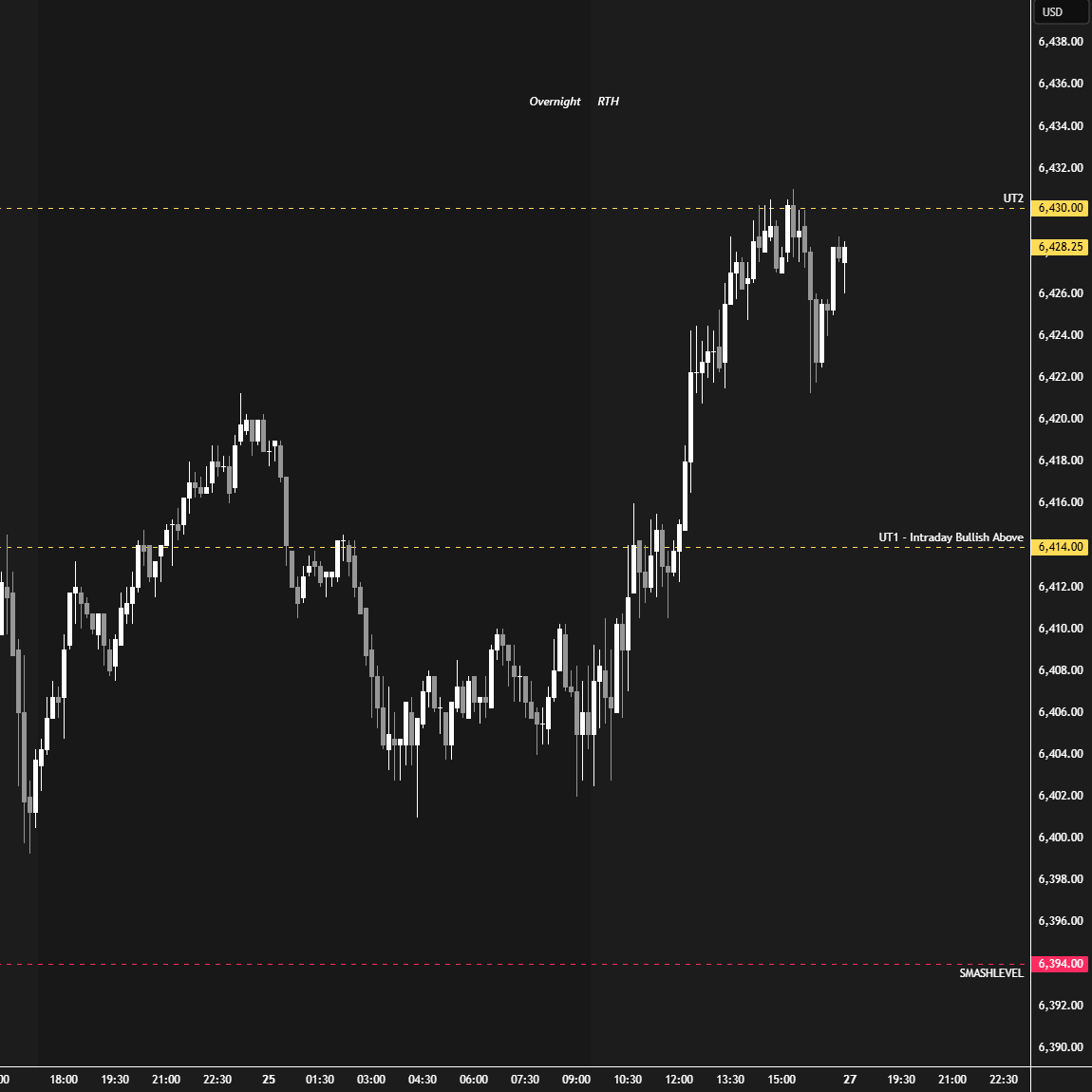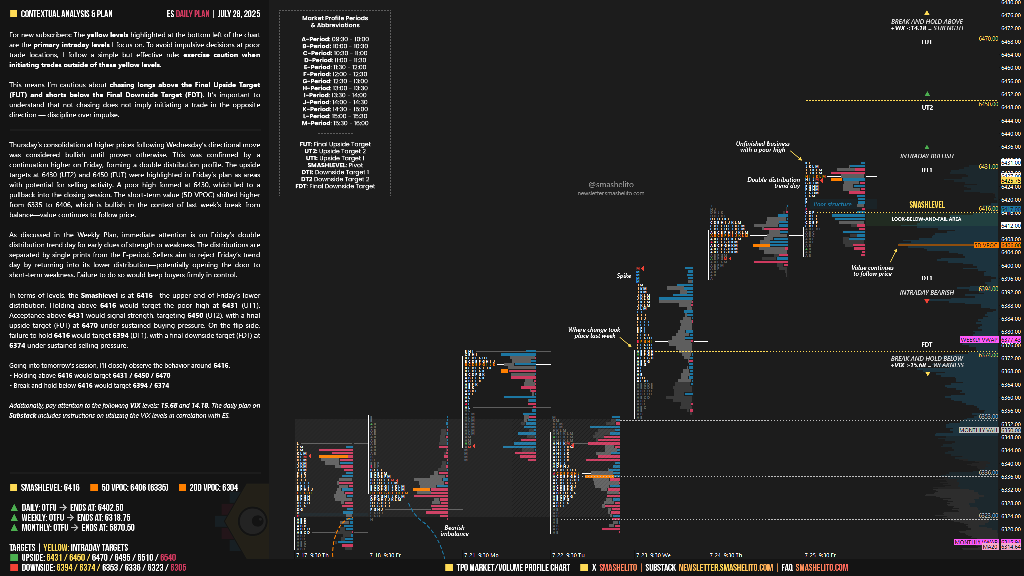 In terms of levels, the Smashlevel is at 6416—the upper end of Friday’s lower distribution. Holding above 6416 would target the poor high at 6431 (UT1). Acceptance above 6431 would signal strength, targeting 6450 (UT2), with a final upside target (FUT) at 6470 under sustained buying pressure.